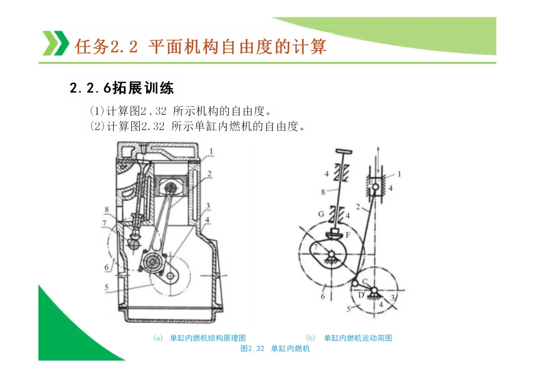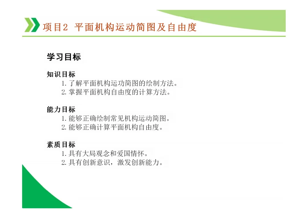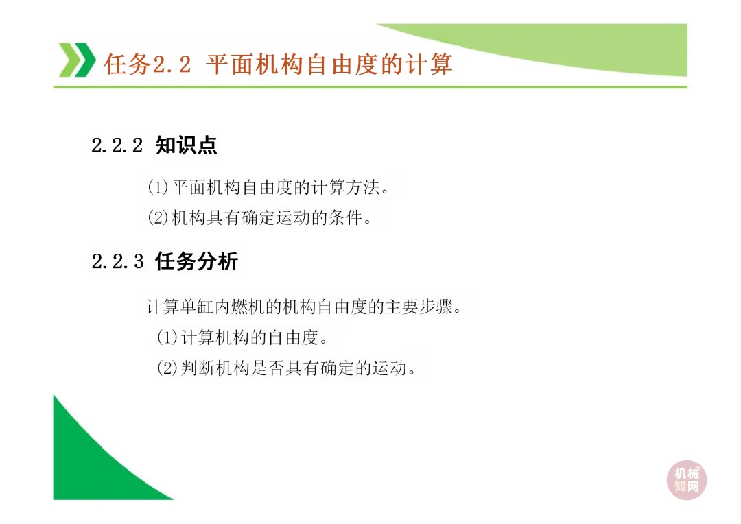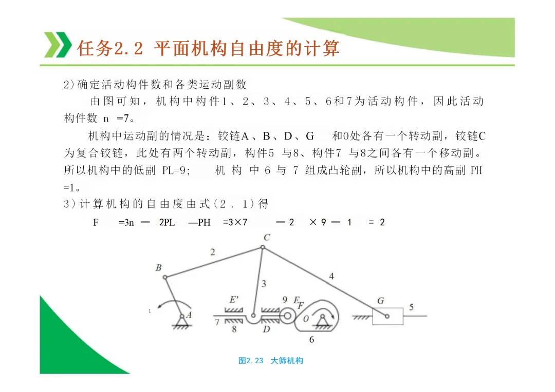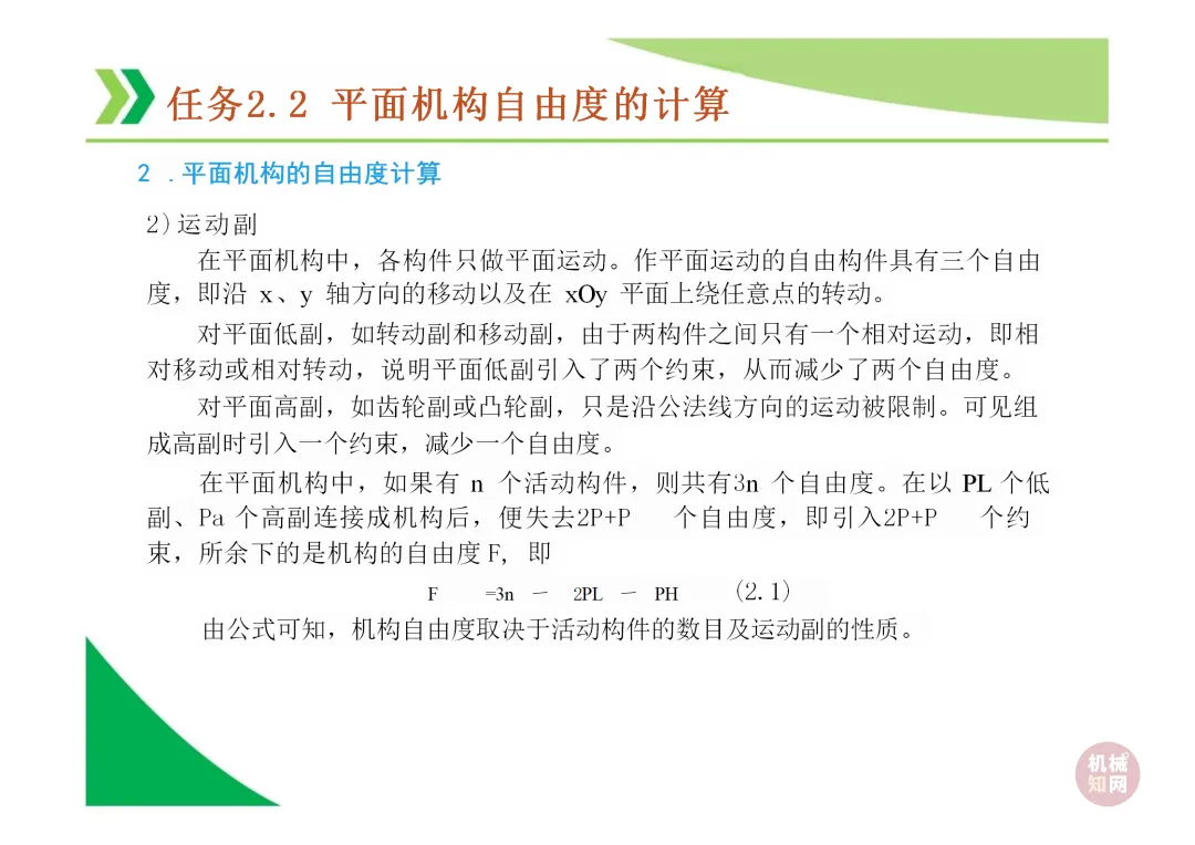 机构自由度 (F):机构具有的独立运动数目。平面机构自由度计算公式为 F = 3n - 2Pl - Ph,其中n为活动构件数,Pl为低副数,Ph为高副数。