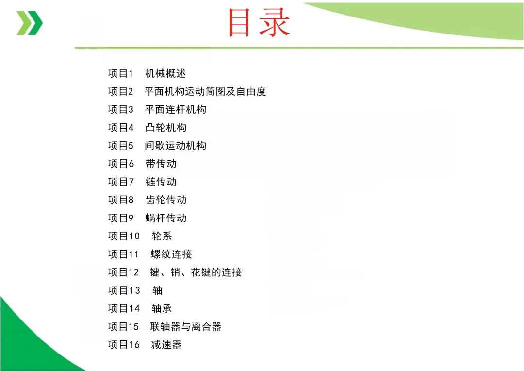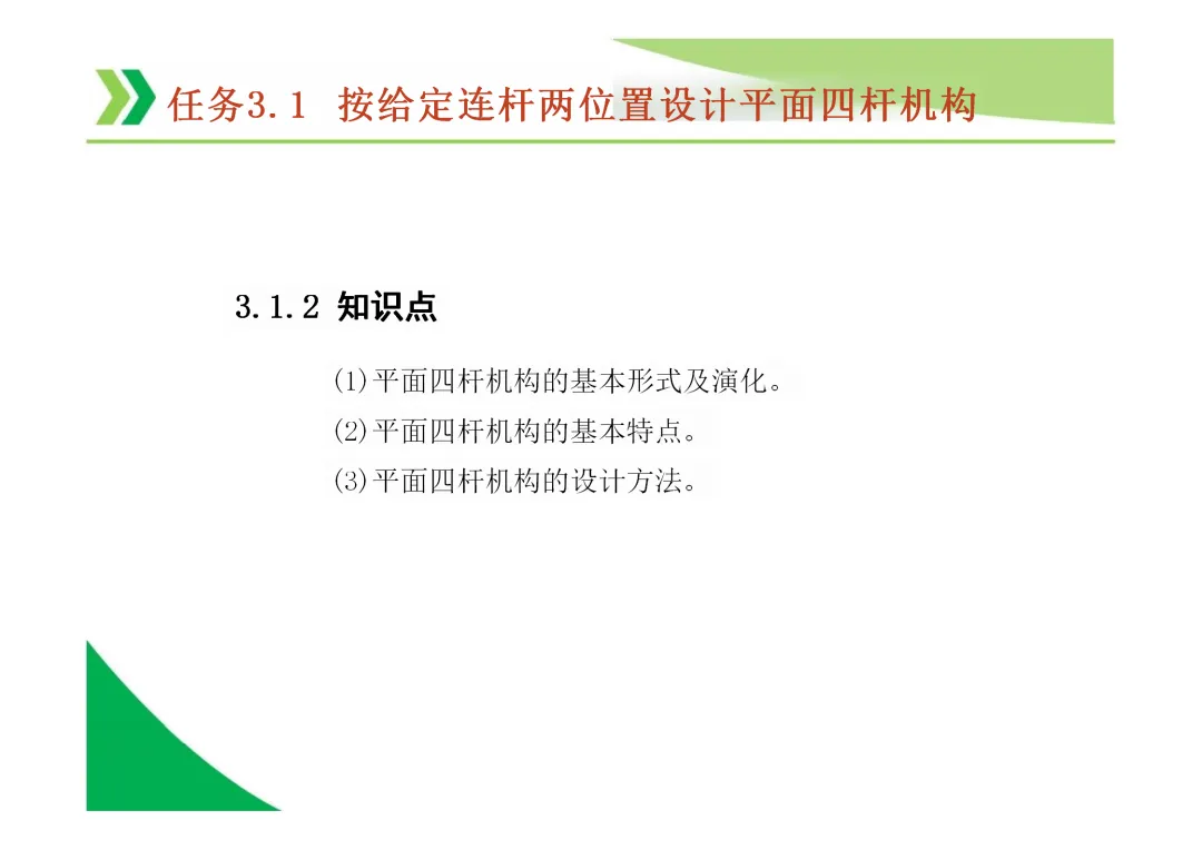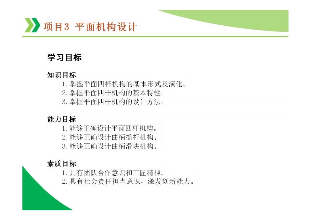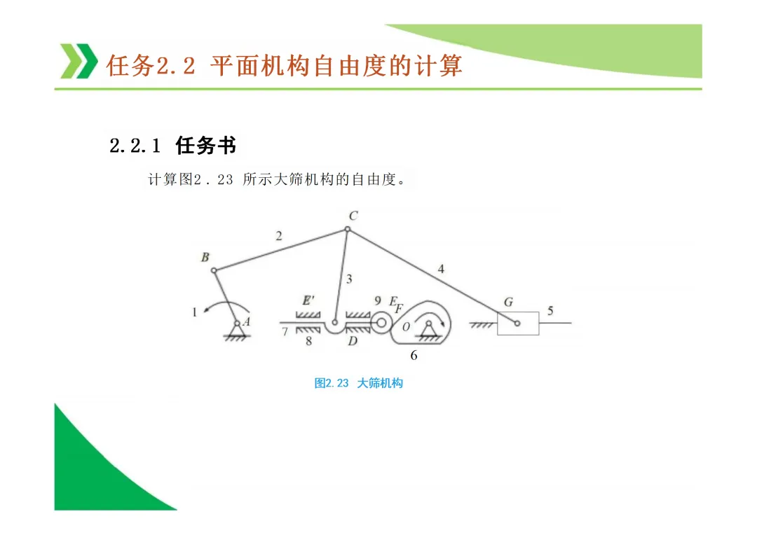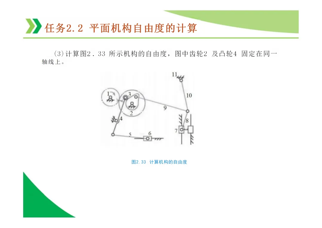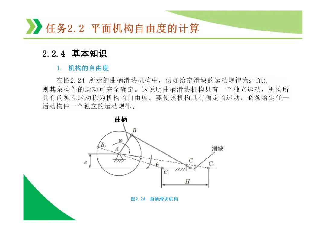 机构自由度 (F):机构具有的独立运动数目。平面机构自由度计算公式为 F = 3n - 2Pl - Ph,其中n为活动构件数,Pl为低副数,Ph为高副数。