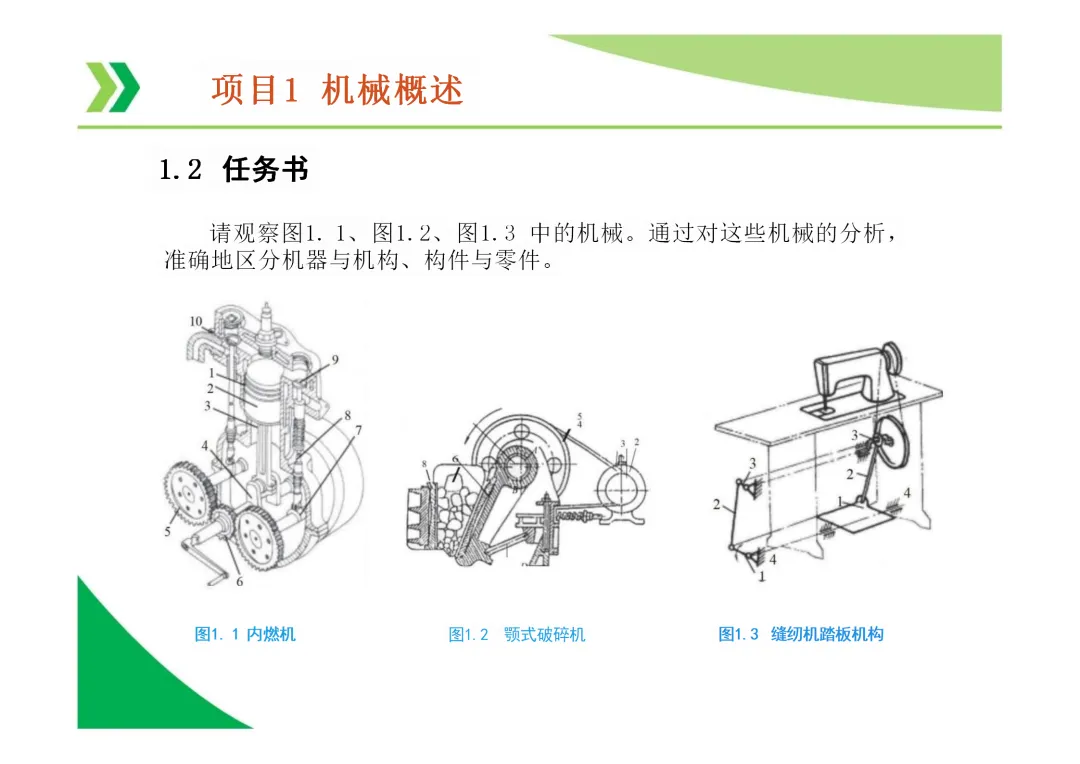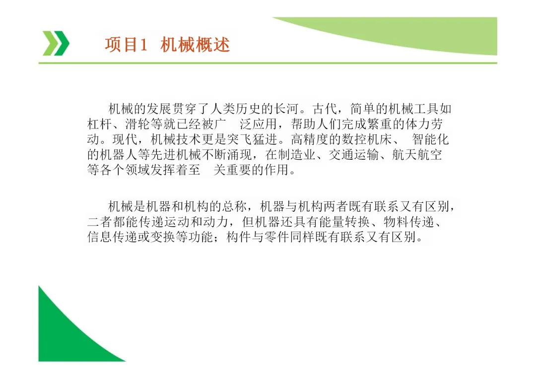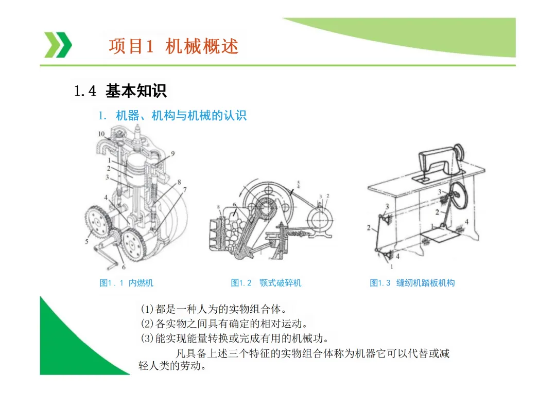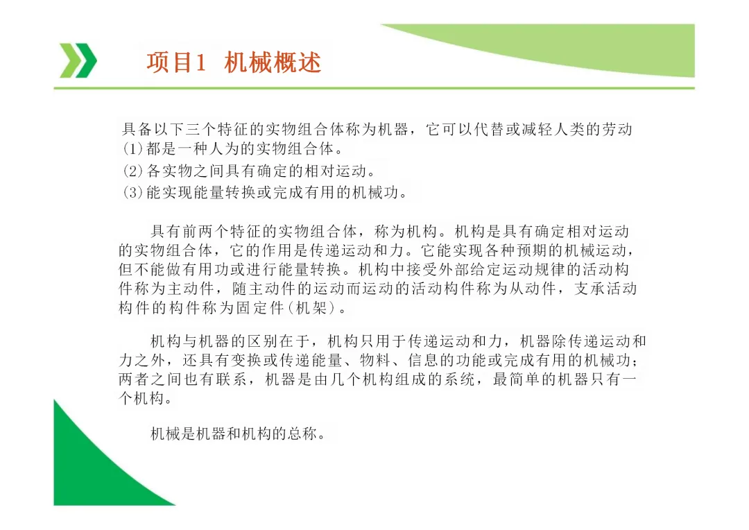机器与机构的区别:机器能实现能量、物料或信息的转换与传递,而机构仅用于传递运动和力,不考虑能量转换。