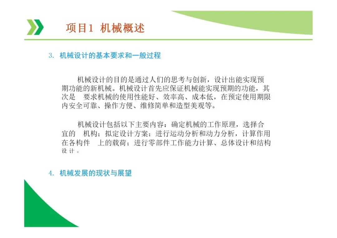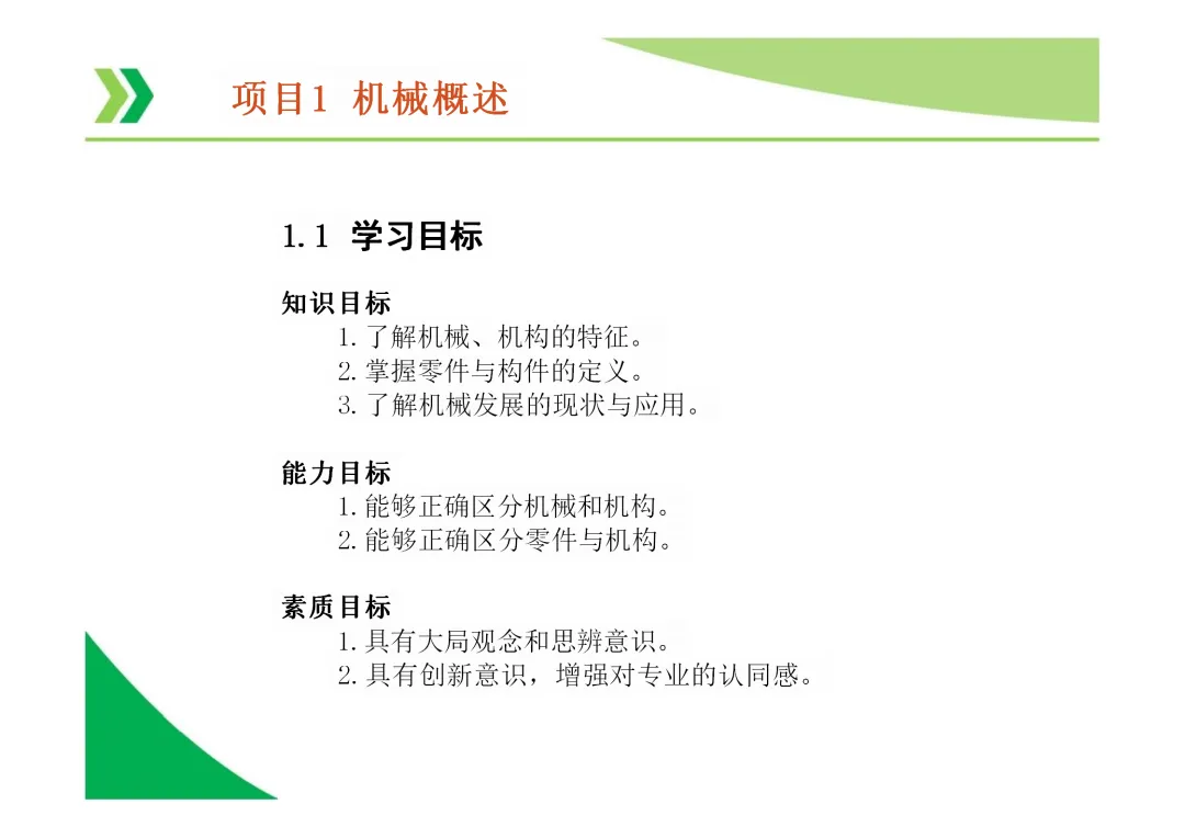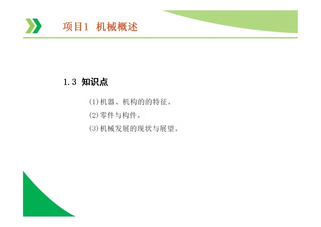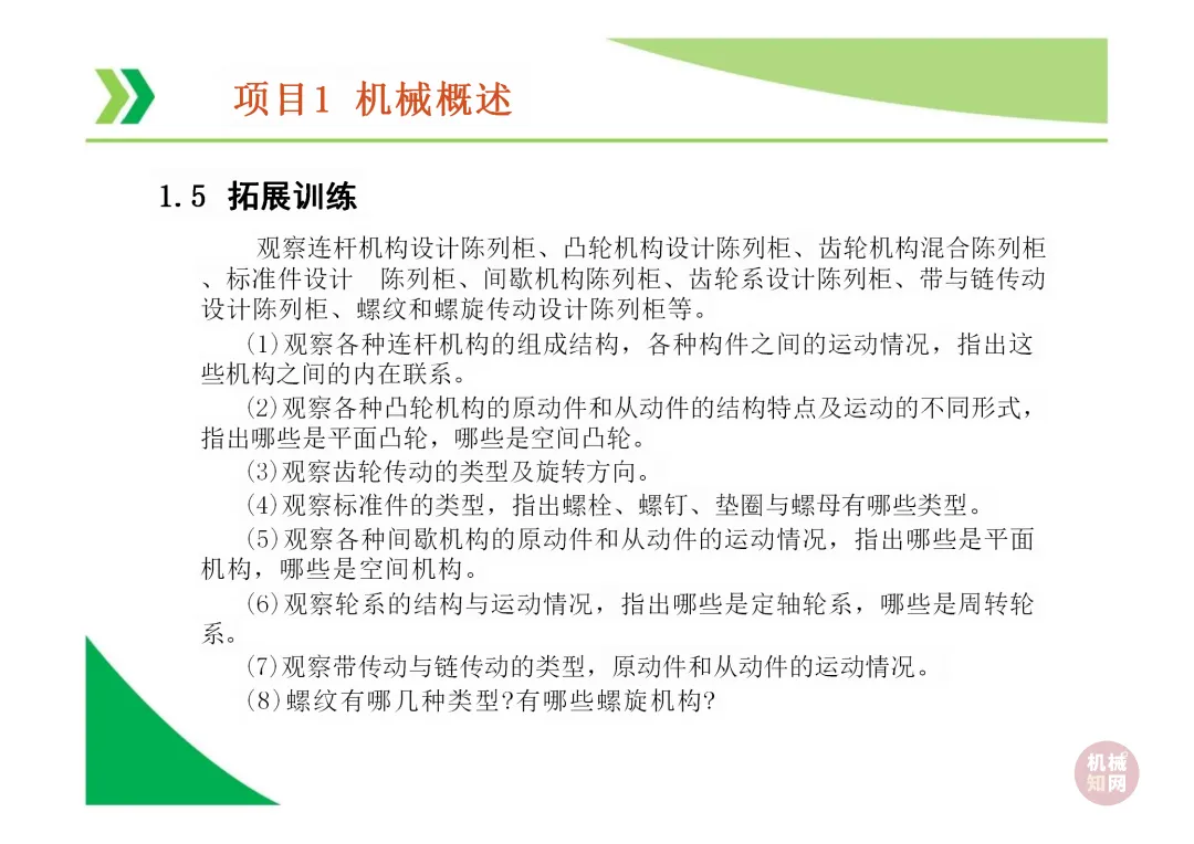机器与机构的区别:机器能实现能量、物料或信息的转换与传递,而机构仅用于传递运动和力,不考虑能量转换。