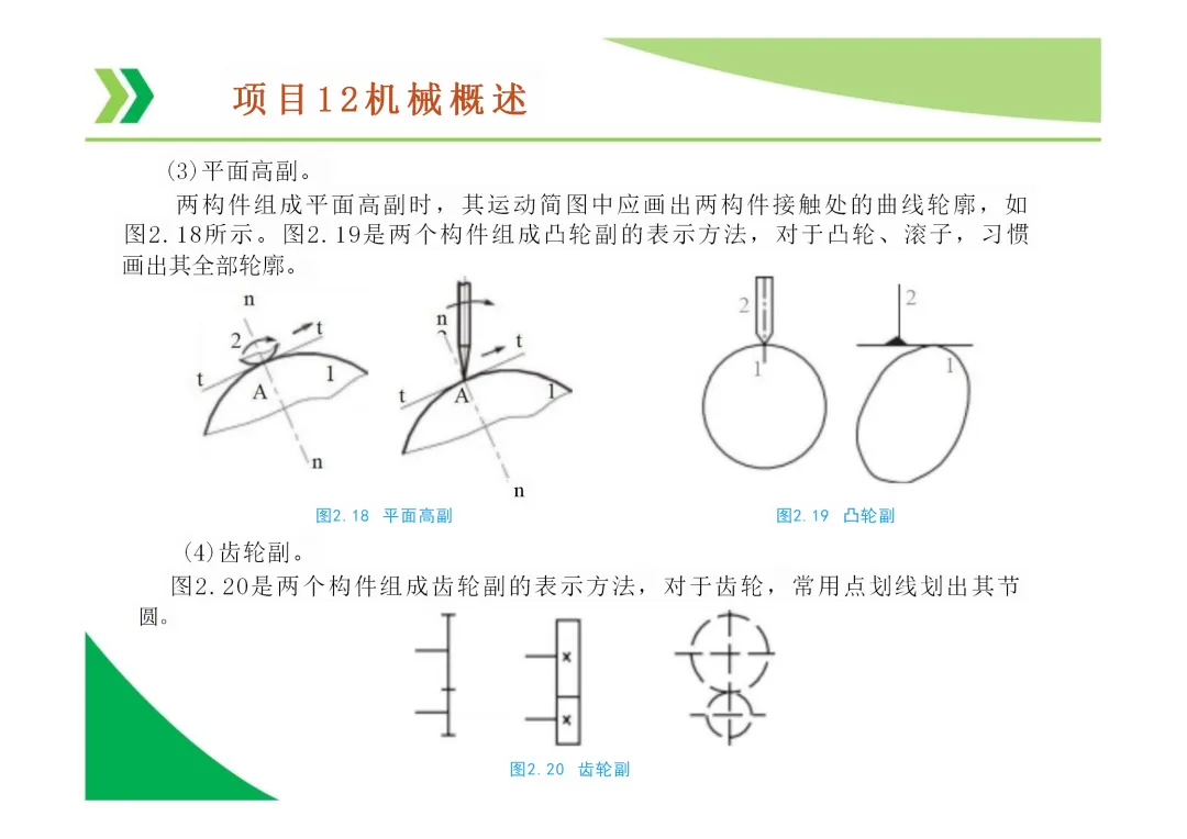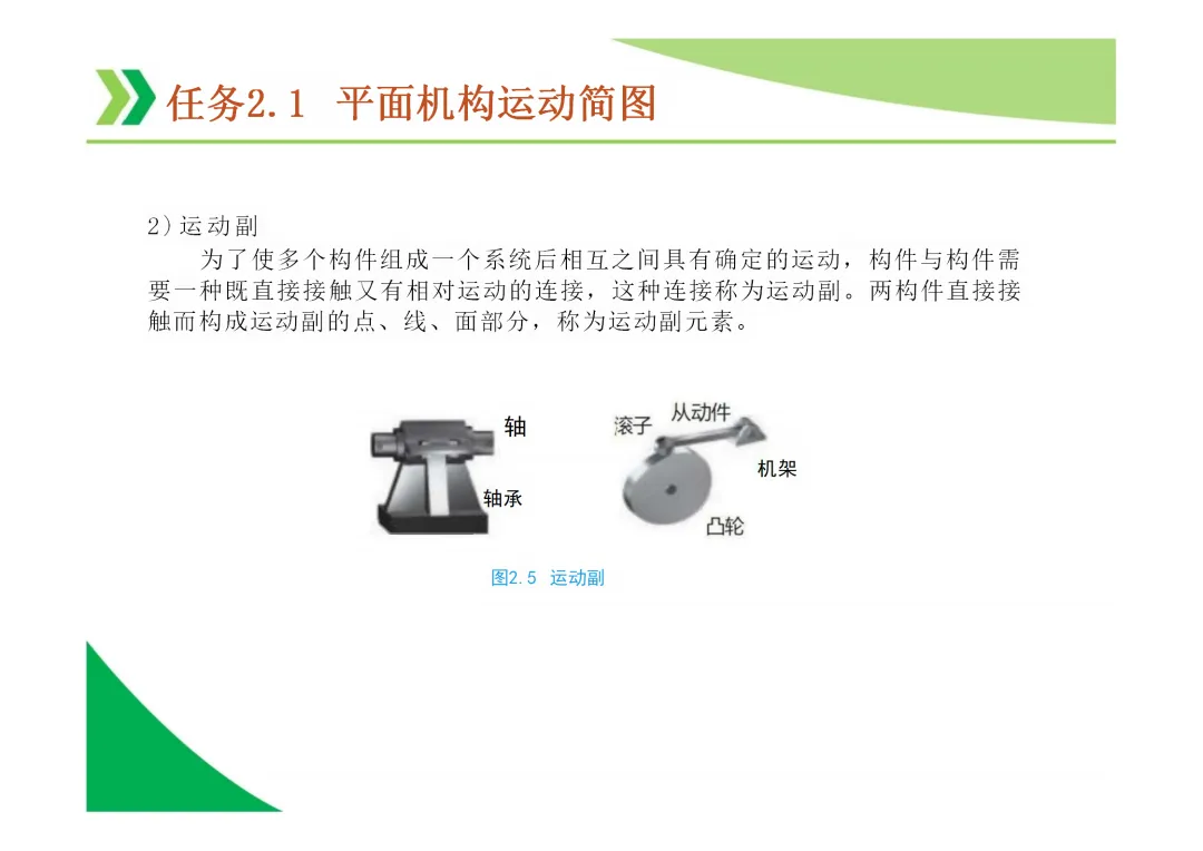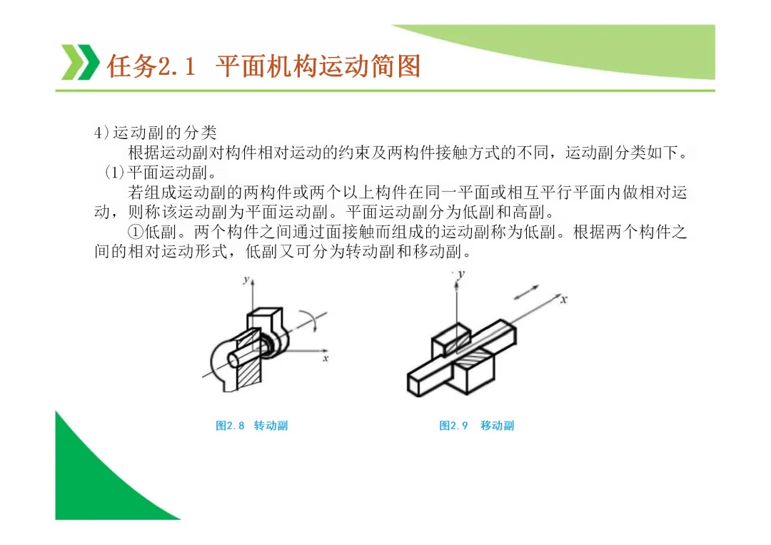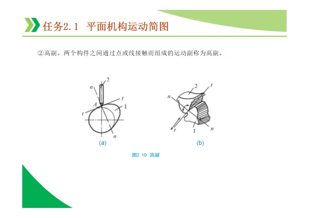 运动副:两构件直接接触并能产生相对运动的连接。分为低副(面接触,如转动副、移动副)和高副(点或线接触)。
