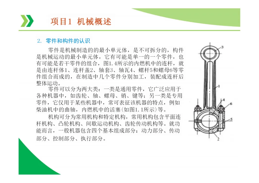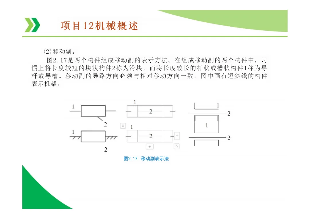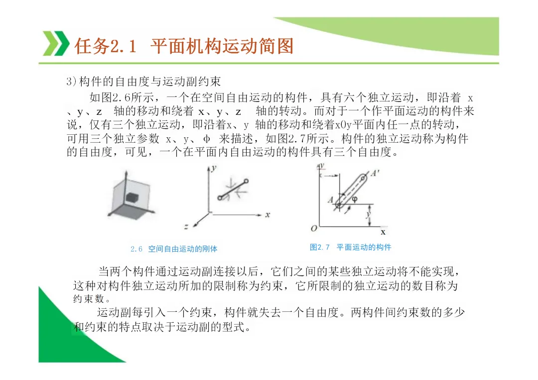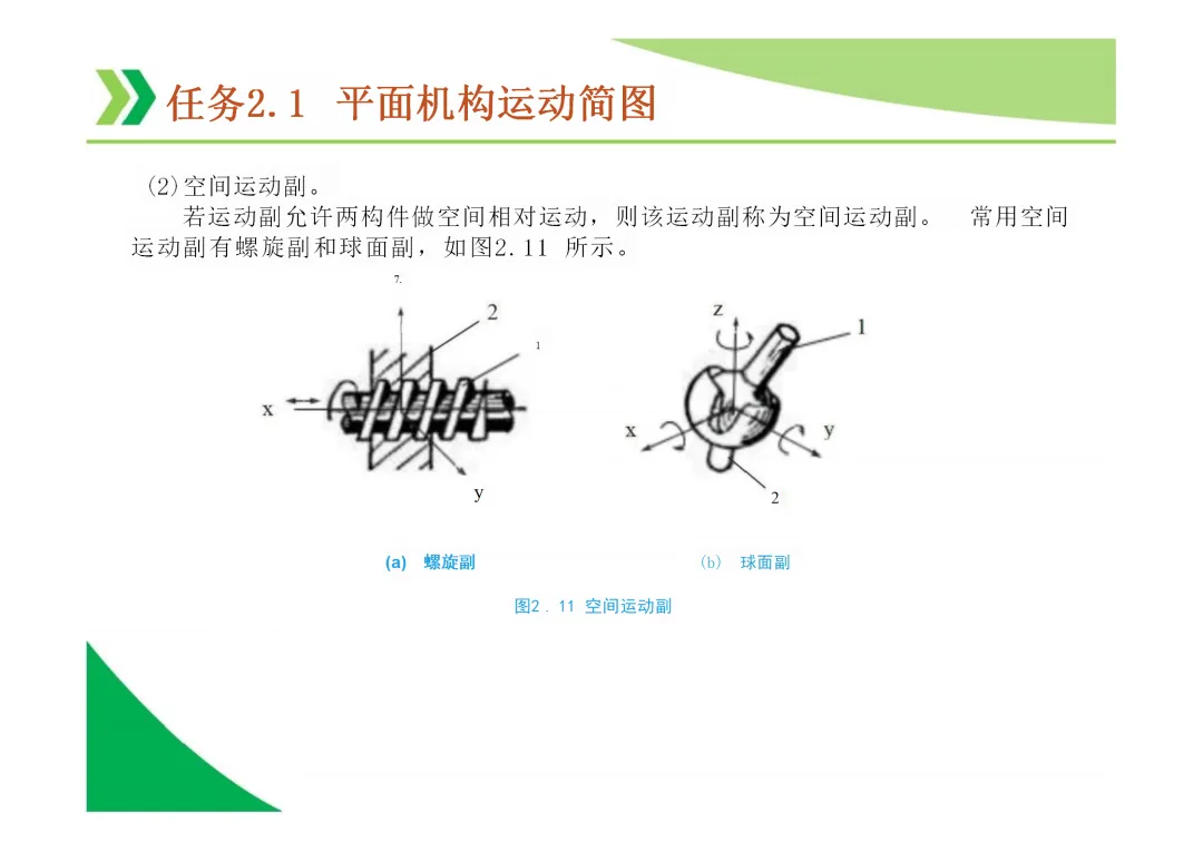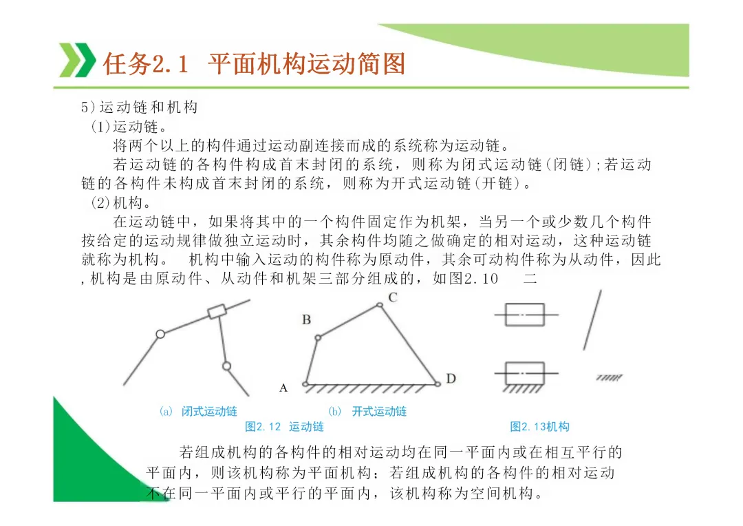 运动副:两构件直接接触并能产生相对运动的连接。分为低副(面接触,如转动副、移动副)和高副(点或线接触)。