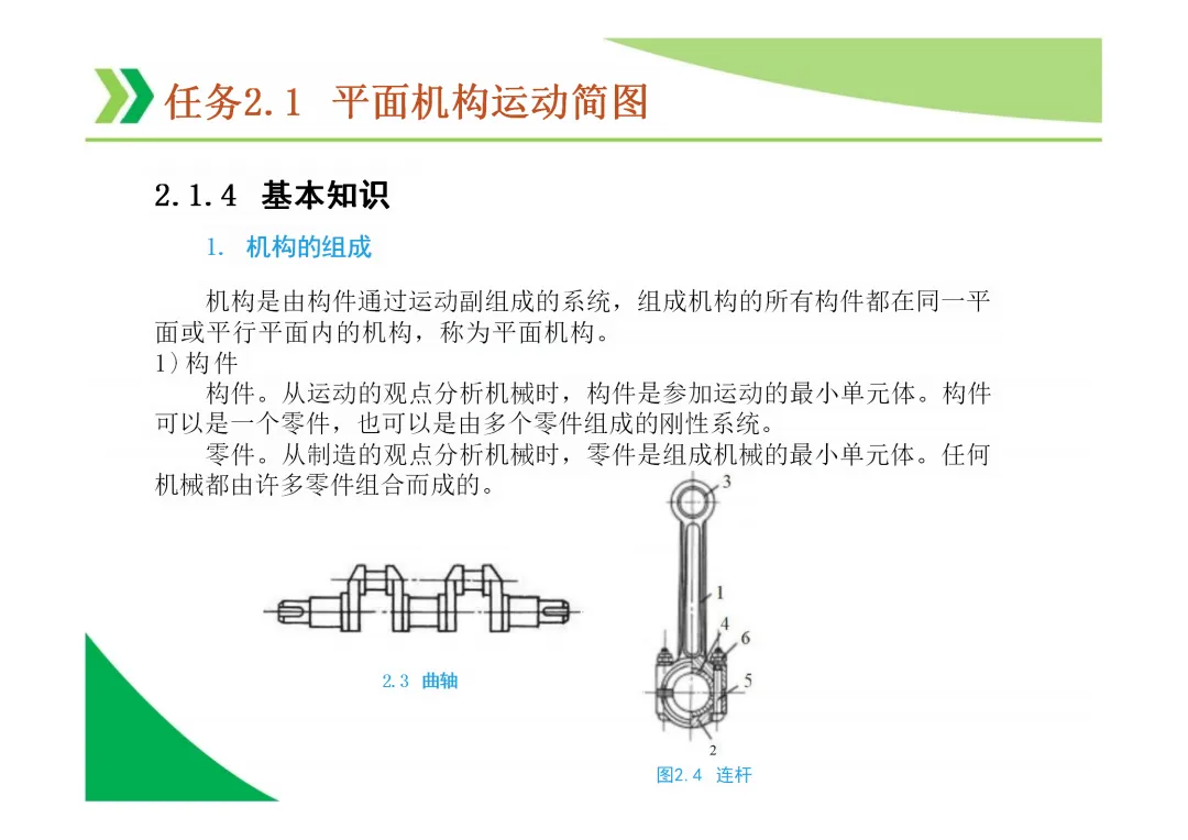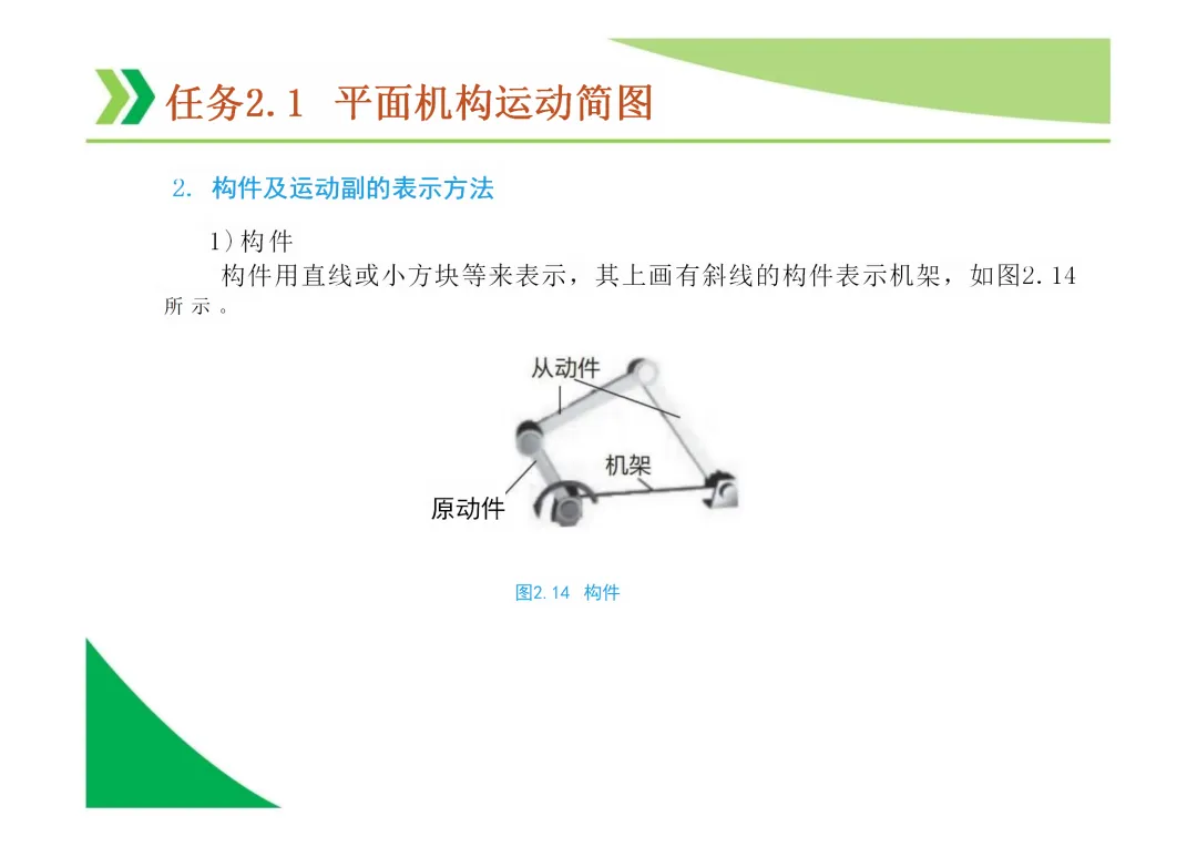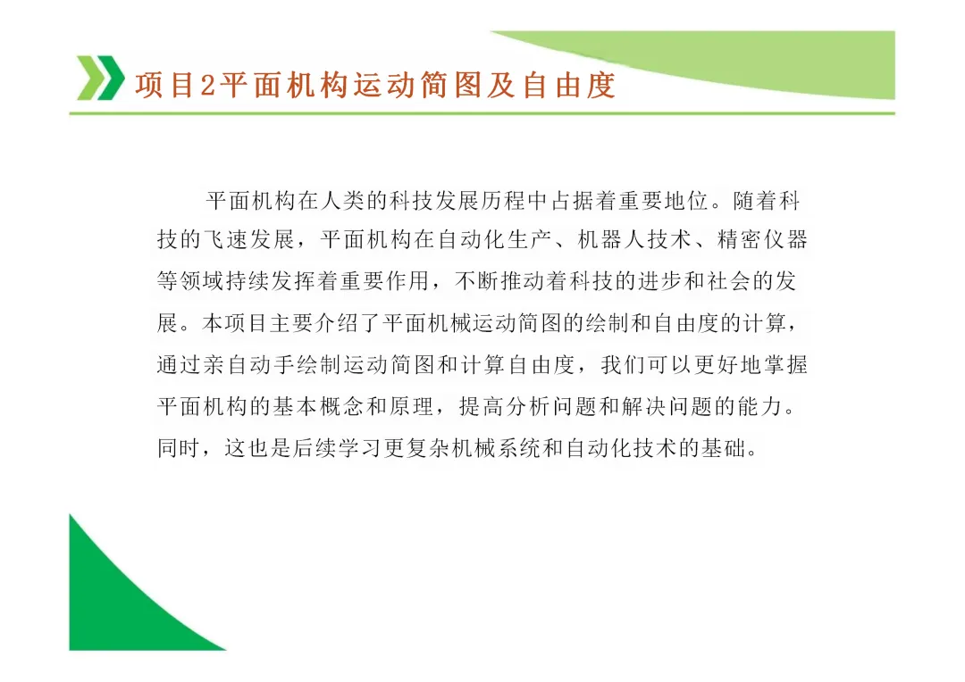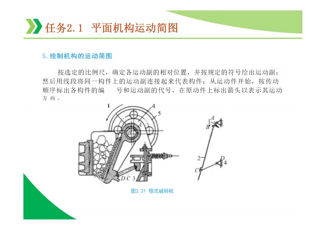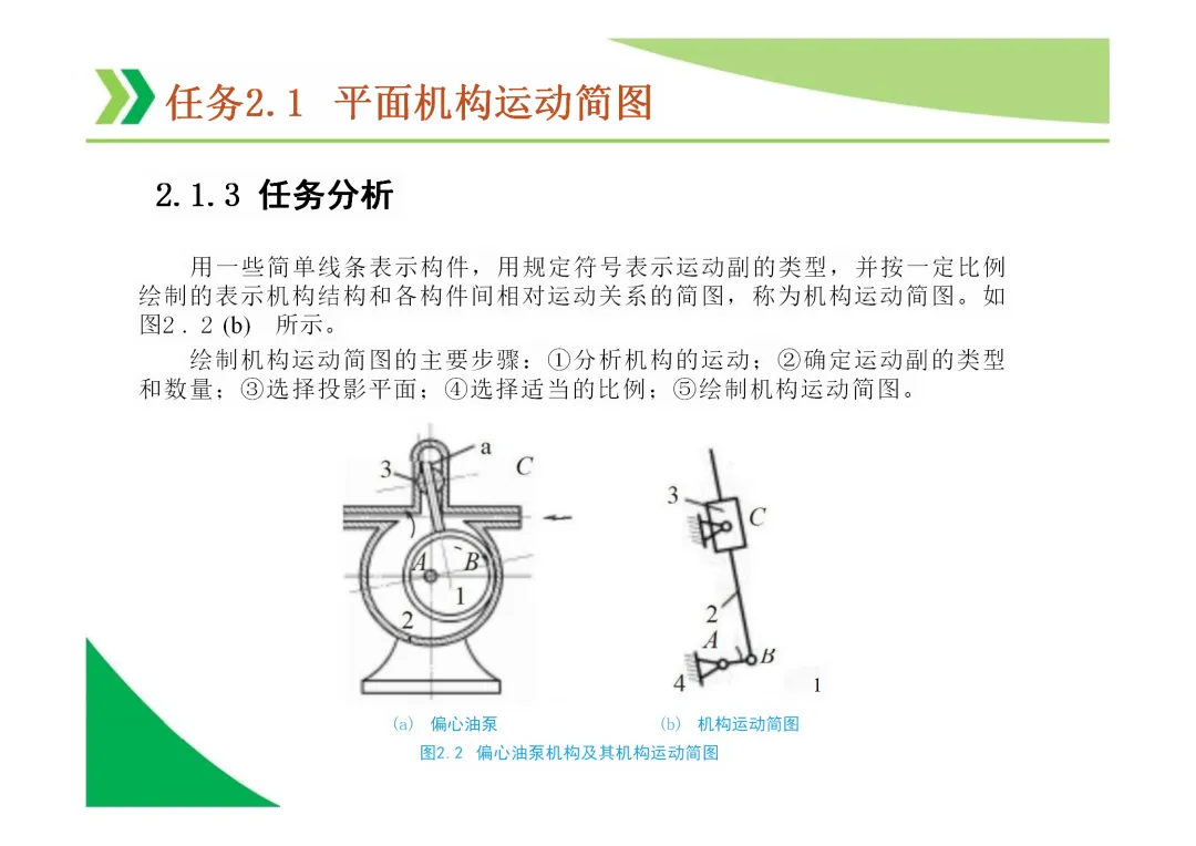 机构运动简图:用简单线条和符号表示机构各构件间运动关系的图形,是分析机构的基础。