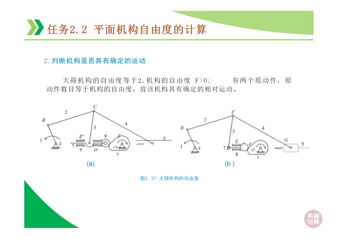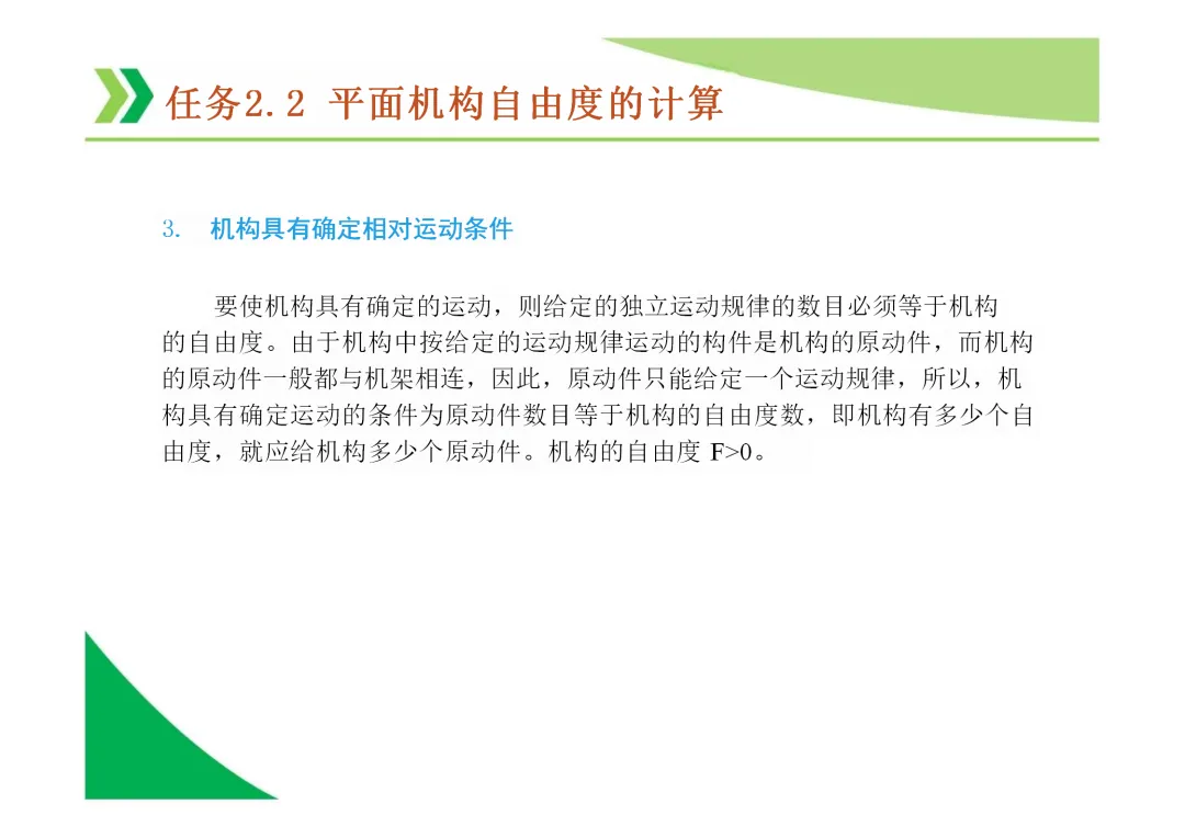 机构具有确定运动的条件:机构自由度 F > 0,且 F 等于原动件数目。