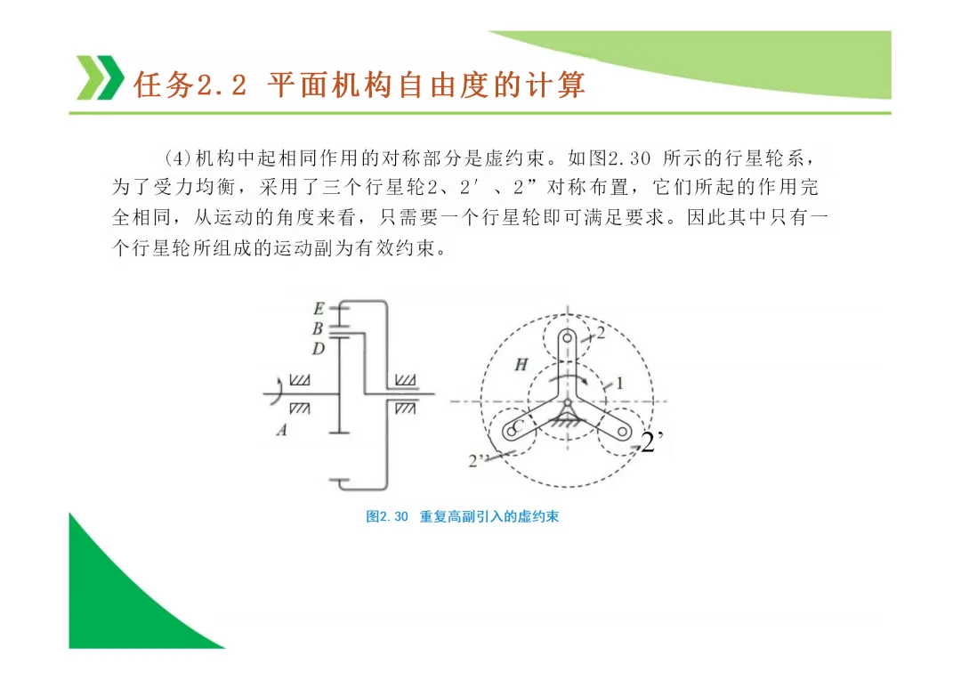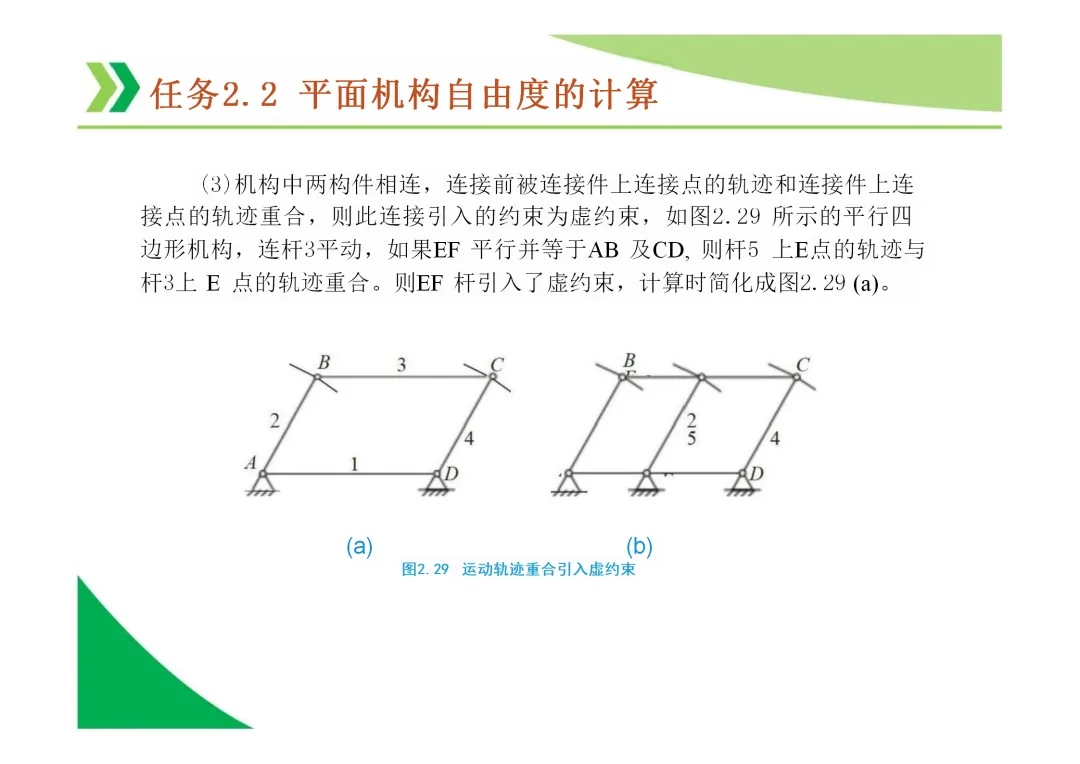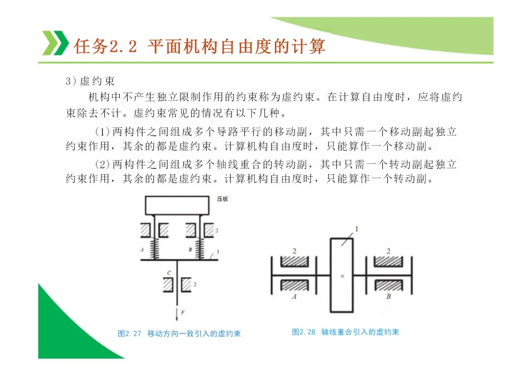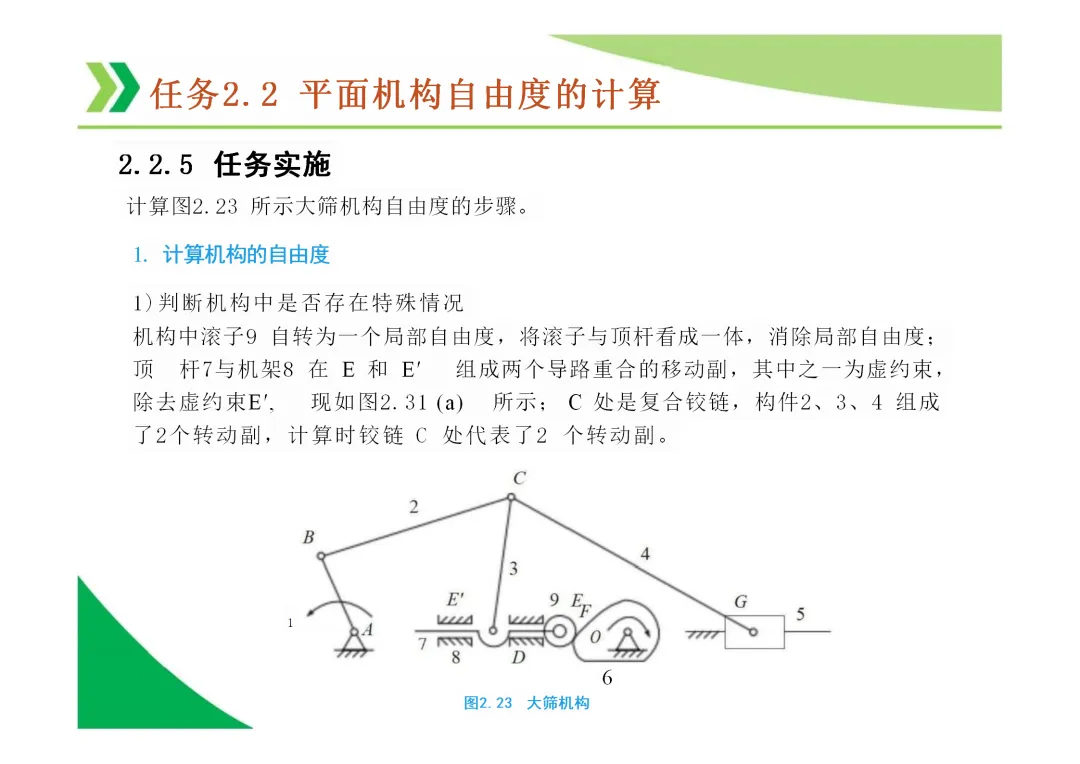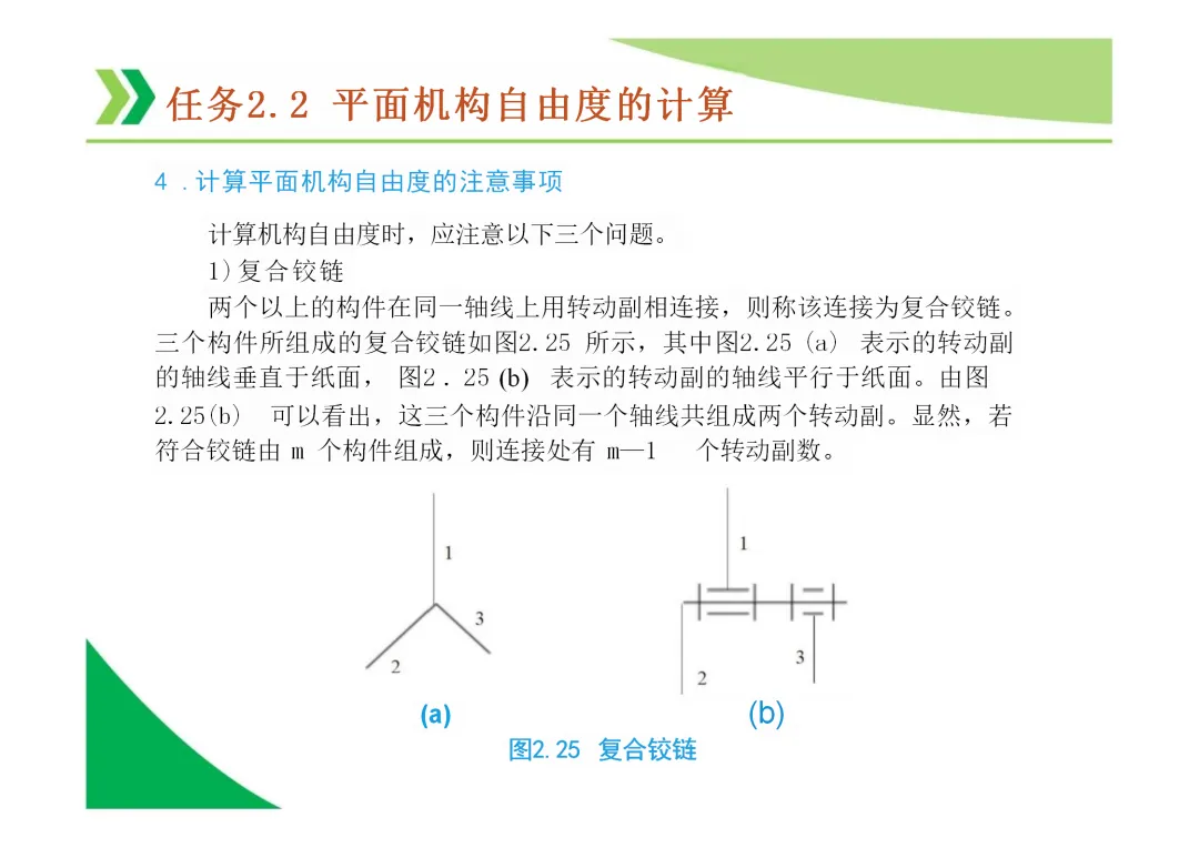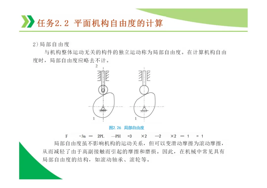 计算自由度时的注意事项:需正确识别和处理复合铰链、局部自由度(如凸轮滚子)和虚约束。