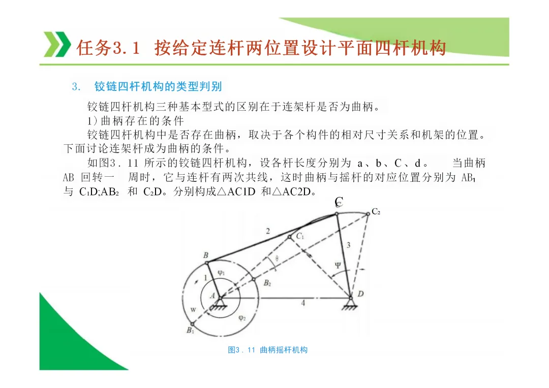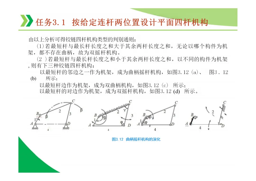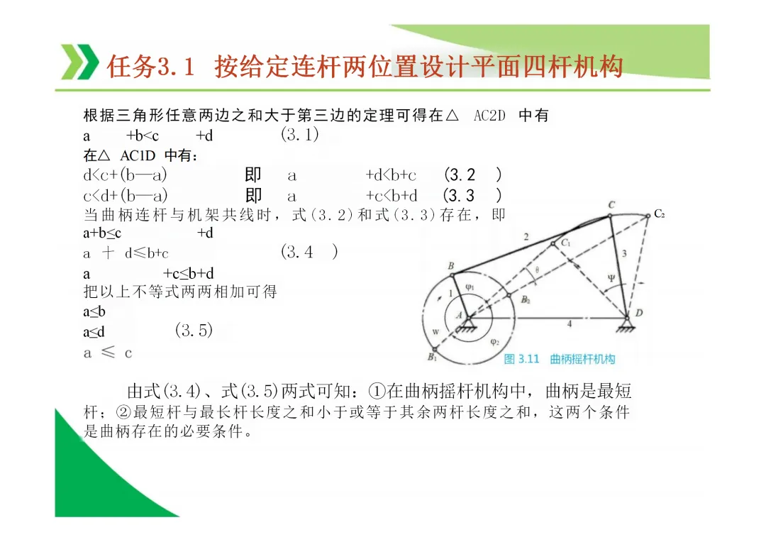 曲柄存在条件(整转副条件):最短杆与最长杆长度之和 ≤ 其余两杆长度之和。