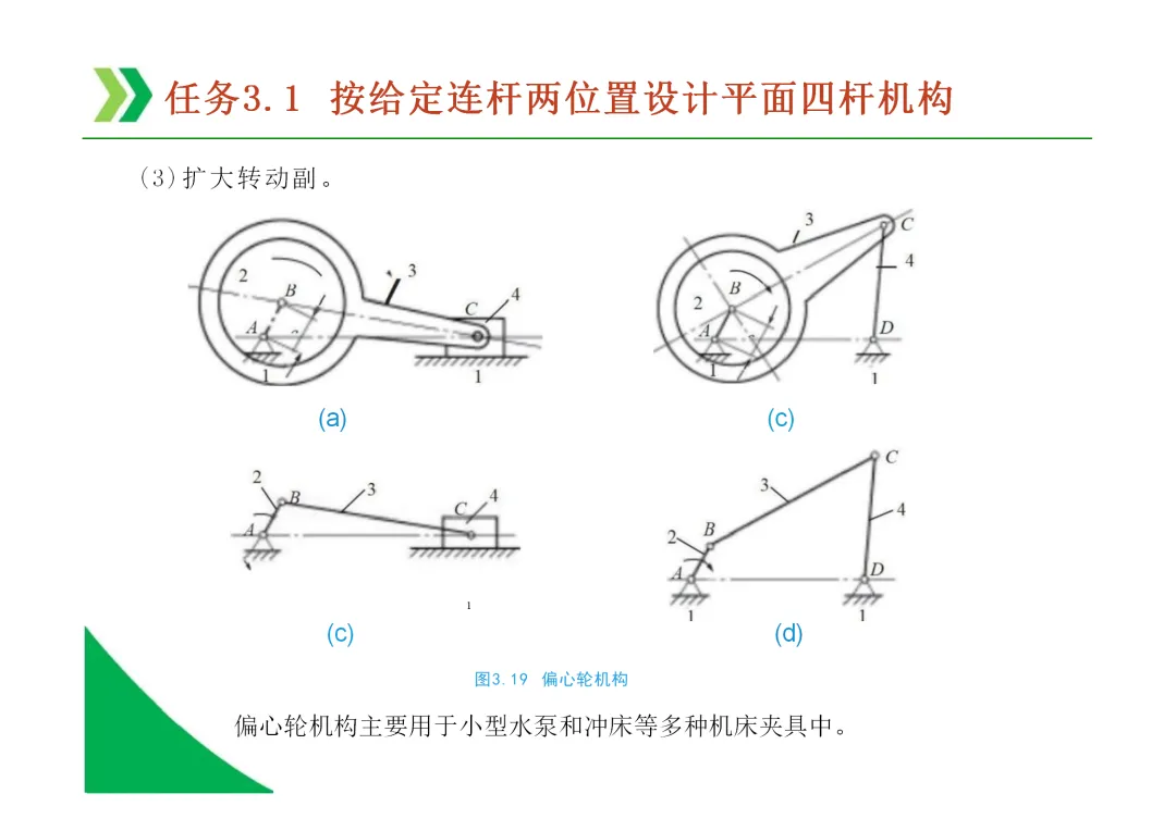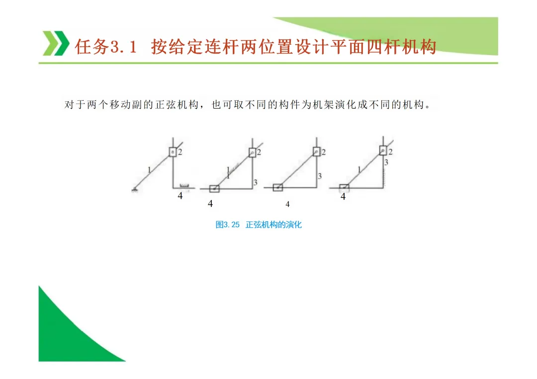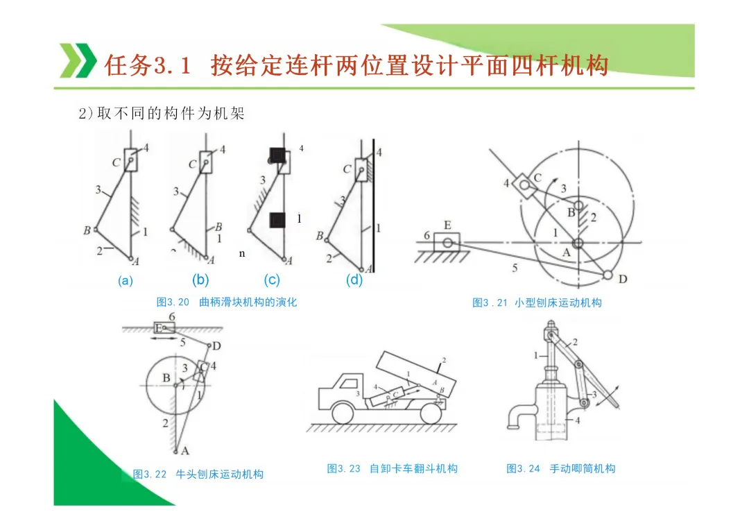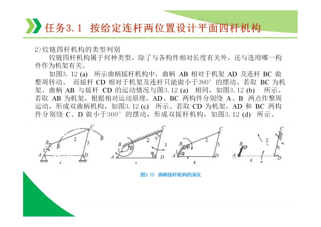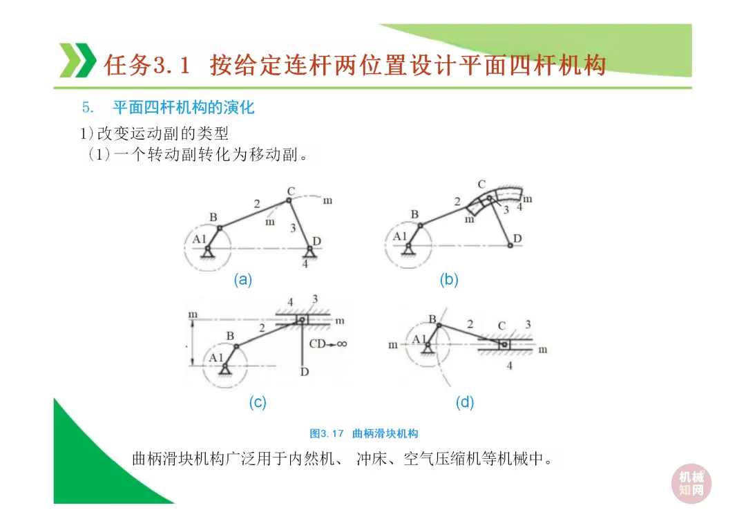 铰链四杆机构的演化:通过转动副转化为移动副,可演化出曲柄滑块机构、导杆机构等多种形式。