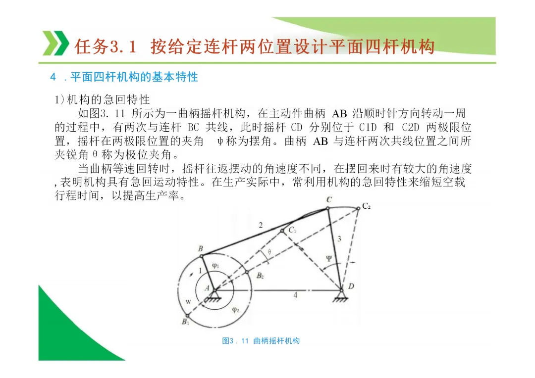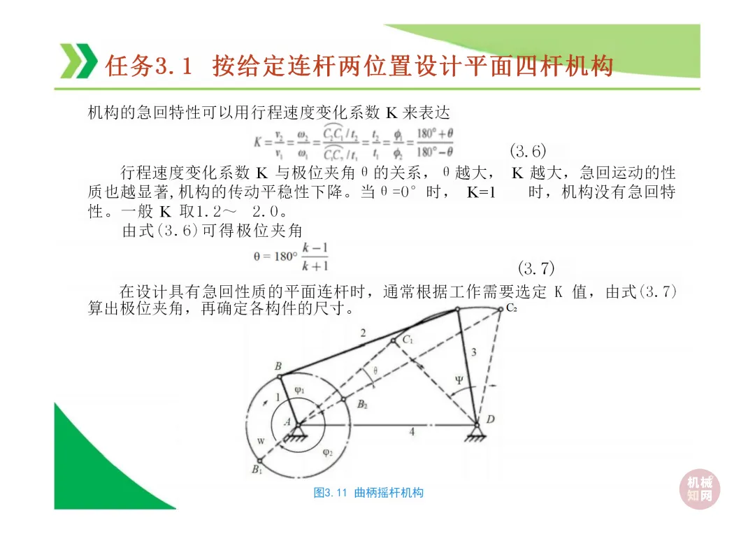急回特性与行程速比系数 (K):当曲柄等速转动时,摇杆往复摆动的平均速度不同,回程速度更快。K = (180°+θ) / (180°-θ),其中θ为极位夹角。θ越大,K越大,急回特性越显著。