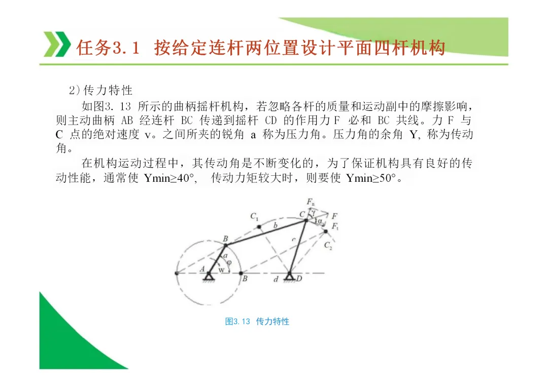 压力角与传动角:压力角是从动件受力方向与速度方向所夹锐角;传动角是其余角。传动角越大(压力角越小),机构传力性能越好。