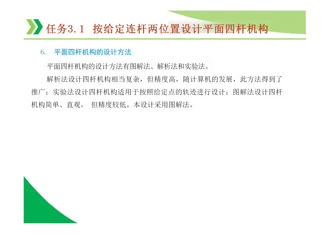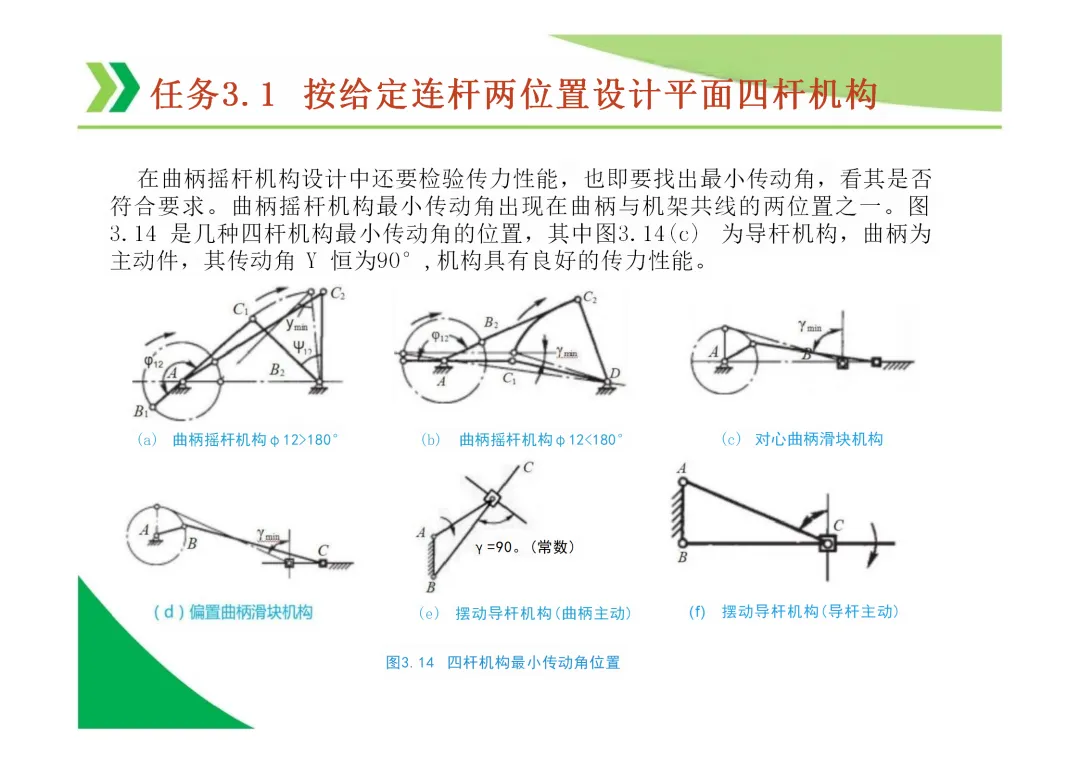 最小传动角的位置:通常出现在曲柄与机架共线的位置,需作图确定。