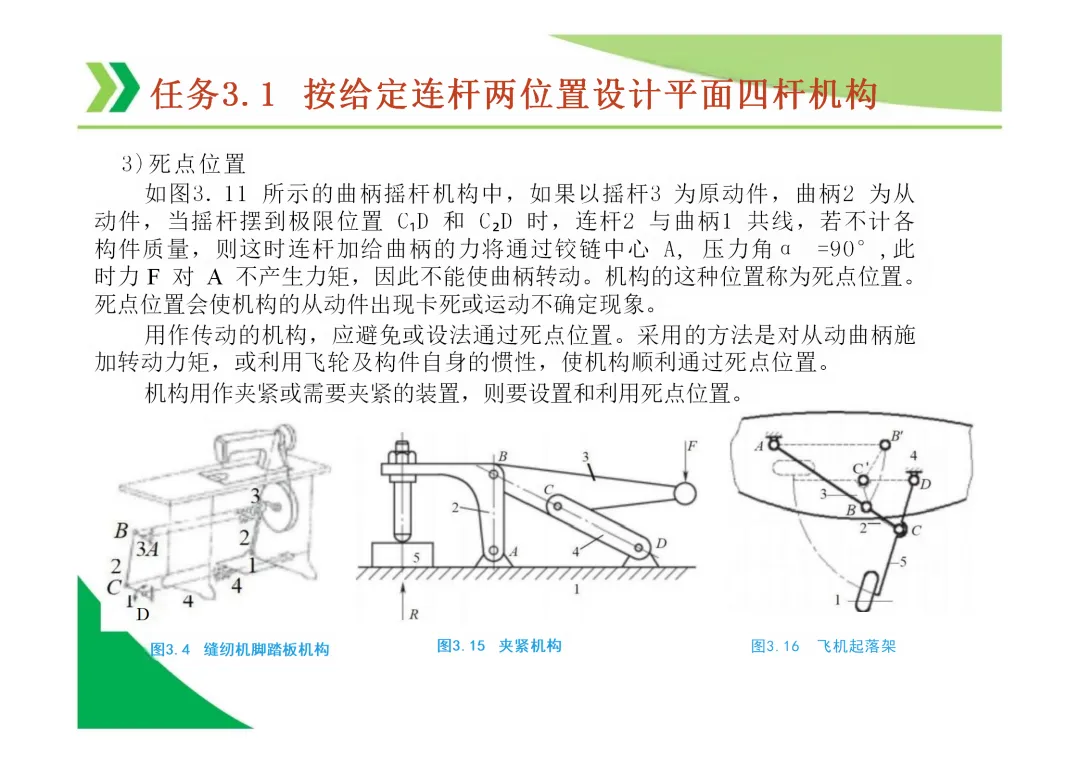 死点位置:当摇杆(或滑块)为主动件,且连杆与从动件(曲柄)共线时,机构处于死点位置,传动角为0。可利用惯性或机构错位等方法通过。