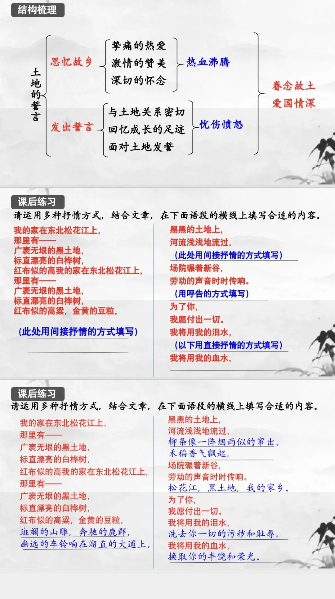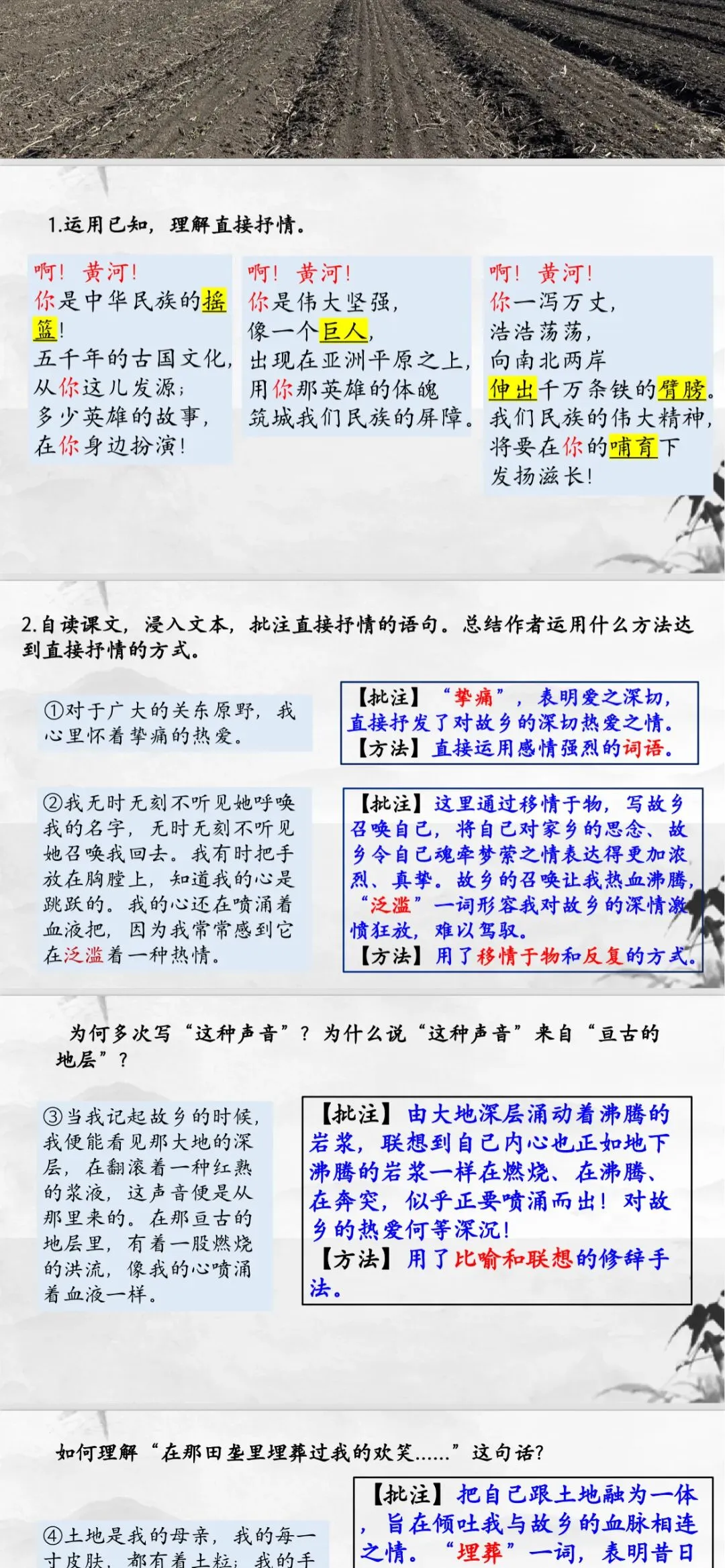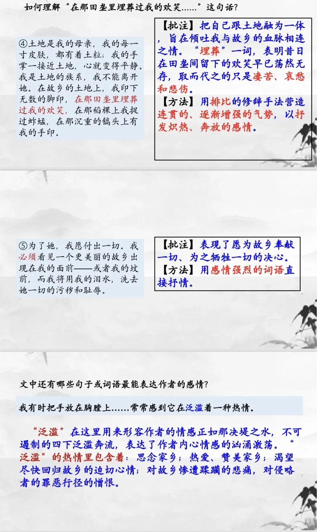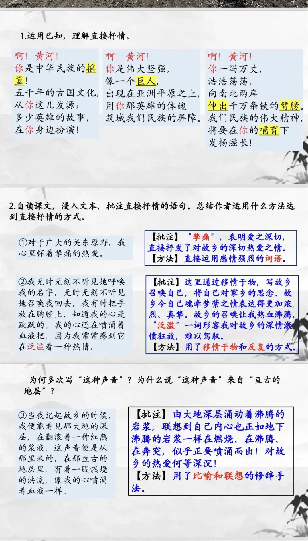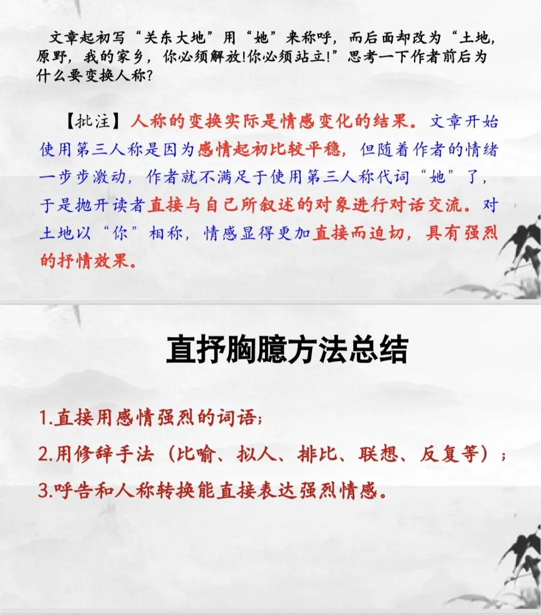 这一部分是重点,主要是让学生知道,直抒胸臆的方式有很多,比如修辞、使用感情色彩强烈的词语、人称转换和反复等,也将旁批问题融入这一环节