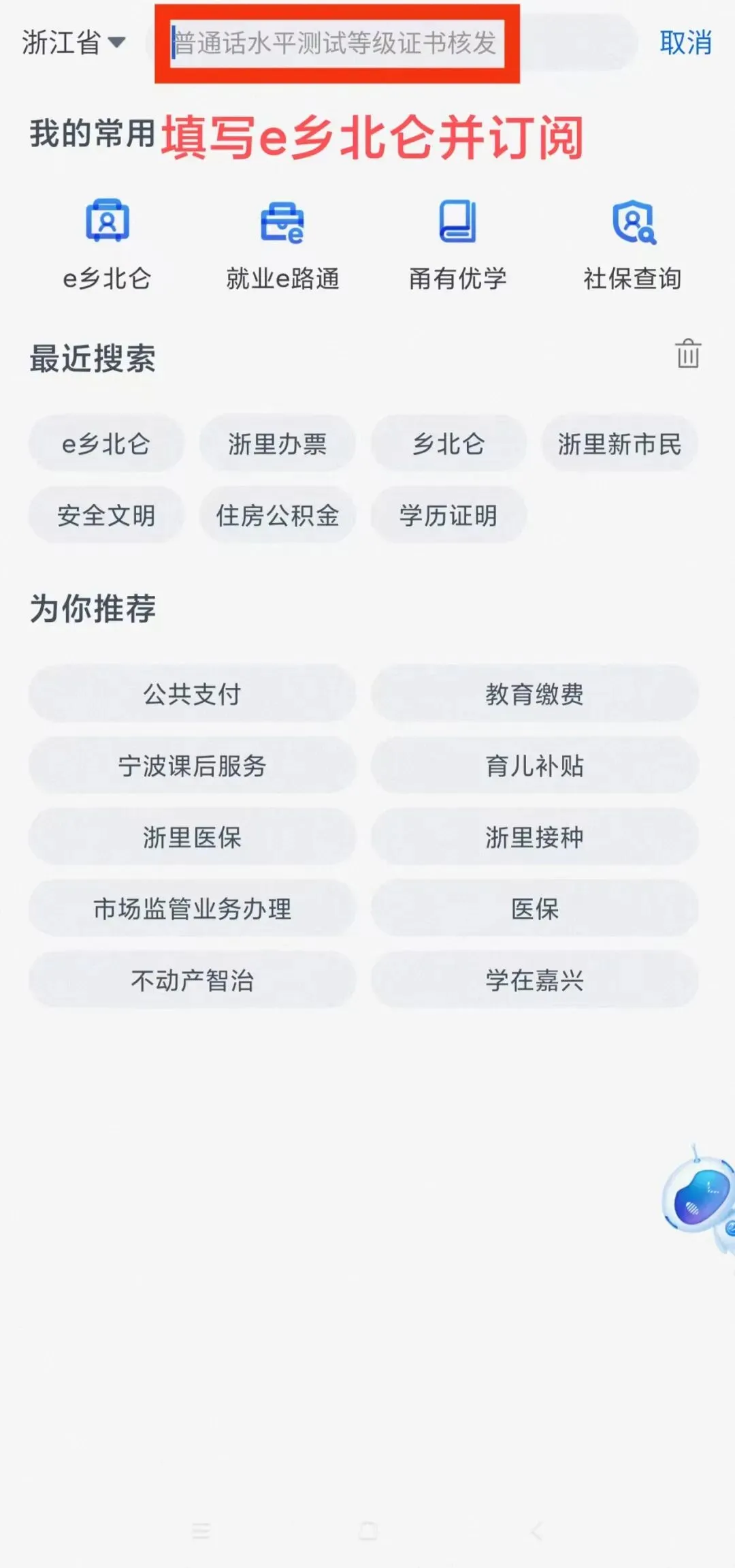 注册完成浙里办APP后,返回APP首页,在顶部的搜索框输入“e乡北仑”进行查找并点击订阅,然后点击进入e乡北仑专题。