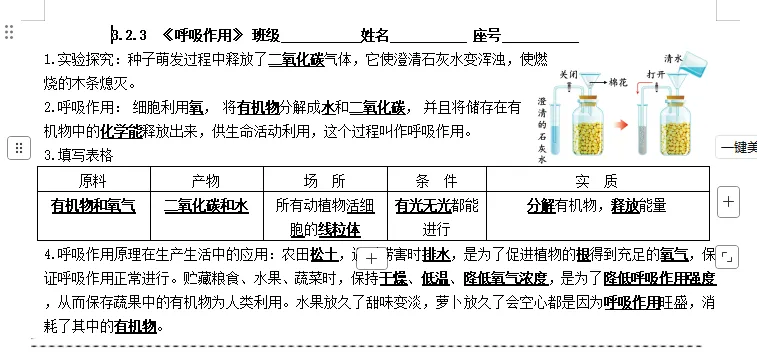 - 蜡烛熄灭实验 → 证明消耗O₂。三大实验证据环环相扣,严谨推导出呼吸作用实质,充分体现“基于事实证据”的科学思维。