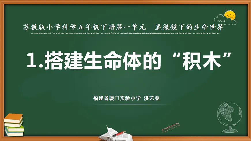 4.师:是的,人、动物、植物等大部分生命体都是由这样的小格子或小颗粒组成的。它们是——搭建生命体的“积木”(贴课题)