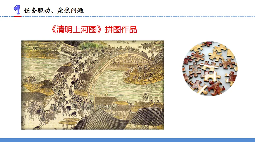 1.师:同学们,我们先一起来欣赏一幅拼图作品,它的原图是出自北宋画家张择端之手,现为我国十大传世名画之一的《清明上河图》,我们知道,再大的拼图作品,它的组成单位也不过是一块块小小的……