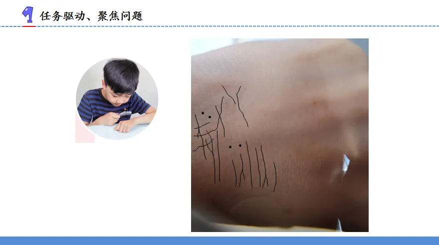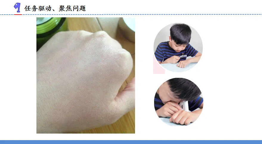2.师:小明同学有疑问了,人的皮肤会不会也像拼图一样,也由一些小单位组成呢?于是,他先后用放大镜、手持显微镜对手背皮肤进行了观察。这是用放大镜观察到的效果,你们有什么发现?