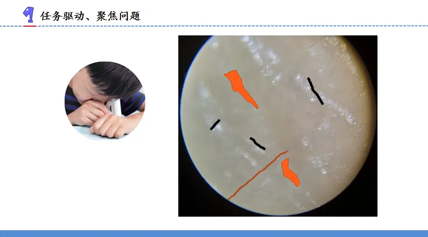 本课遵照认识微小个体的主要进程,采用递进式的逻辑结构,从发现细胞到认识细胞的多种形态,展开两个部分的内容。