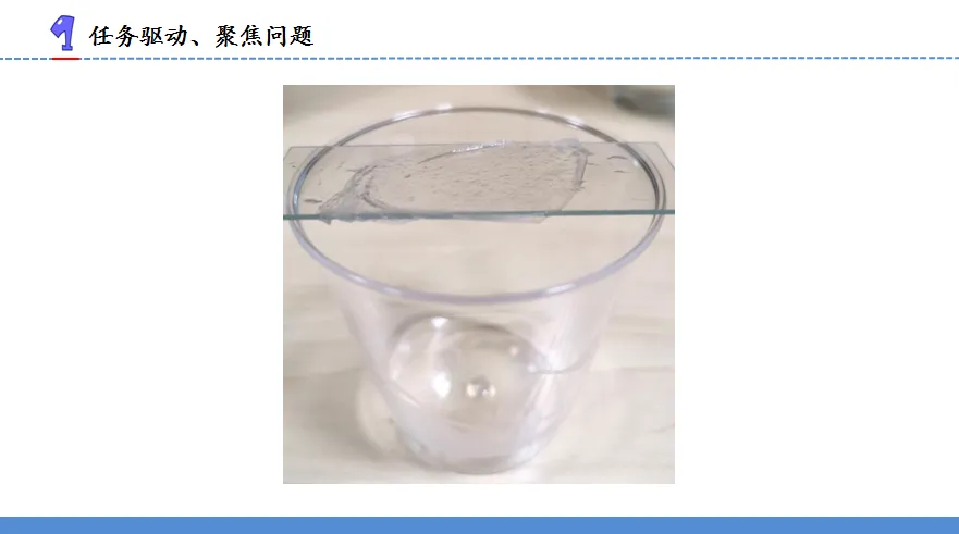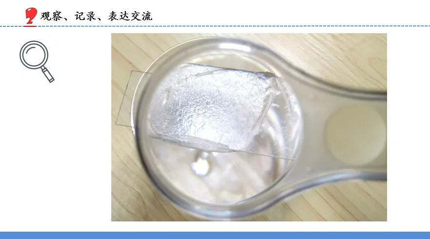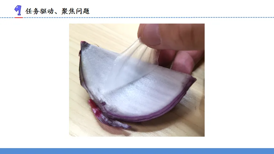 6.师:大家的答案不尽相同,今天我们就一起通过观察和探究,找出答案。为了方便观察,老师把洋葱鳞片内表皮取了下来,剪成小块,铺在一块玻璃片上,并架在塑料杯上。