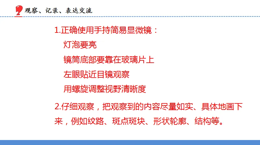 2.师:接下来请大家换用手持简易显微镜来观察,有几个要求:1.正确使用手持简易显微镜(灯泡要亮、镜筒底部要靠在玻璃片上、用螺旋调整视野清晰度,左眼贴近目镜) 2.仔细观察,把观察到的内容尽量如实、具体地画下来,例如纹路、斑点、形状、轮廓、结构等。