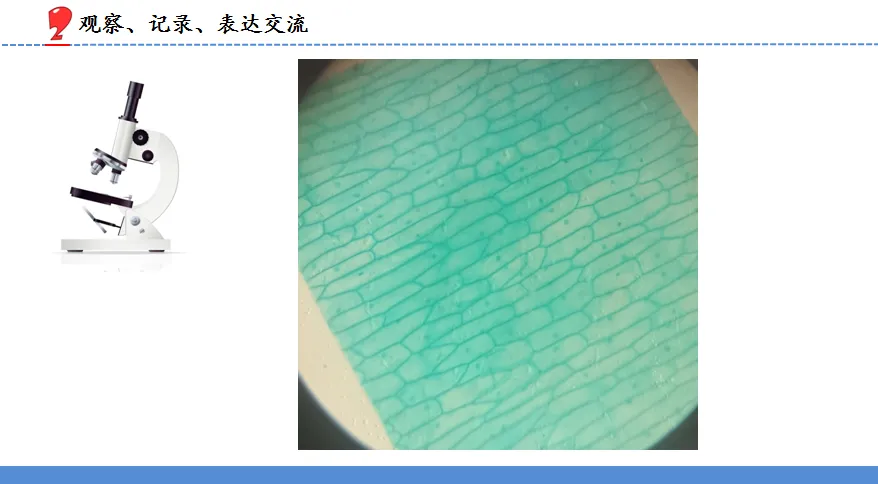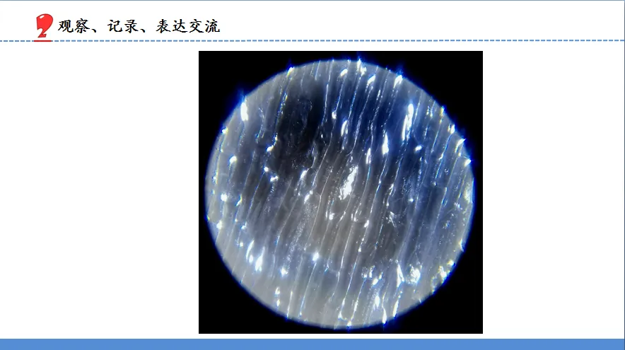 观察结束,师将2-3位学生的观察记录单分别展示出来,请他们描述自己所观察到的内容,引导学生说出:“格子、颗粒、排列、堆砌、像砖头、像积木”等关键词,引导他们说出用光学显微镜观察到的与前面两种工具观察到的有什么不同,让学生体会到随着工具的迭代,观察所得也逐渐的细致入微、清晰明朗,学生发言结束,请其他同学补充,该过程让学生充分表达,营造师生、生生互动的场景。最后师展示显微镜下拍到的画面,与学生的描绘进行比对。