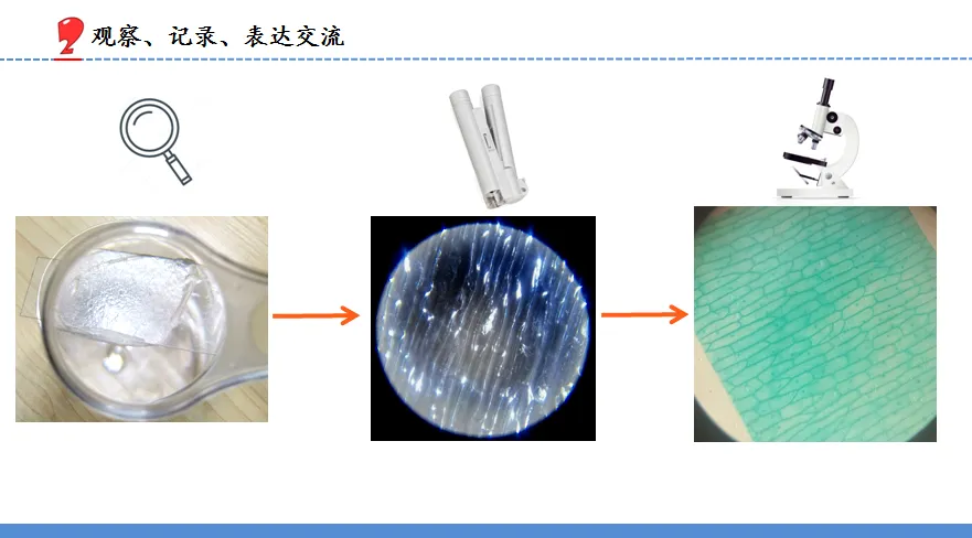 5.师:刚才我们用三种不同的工具观察洋葱鳞片内表皮,收到了不同的信息,随着工具的迭代,观察所得也逐渐的细致入微、清晰明朗。