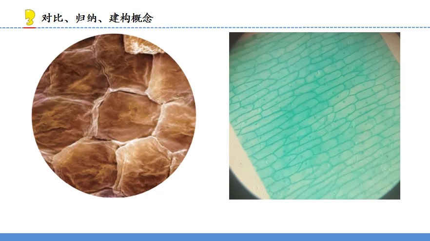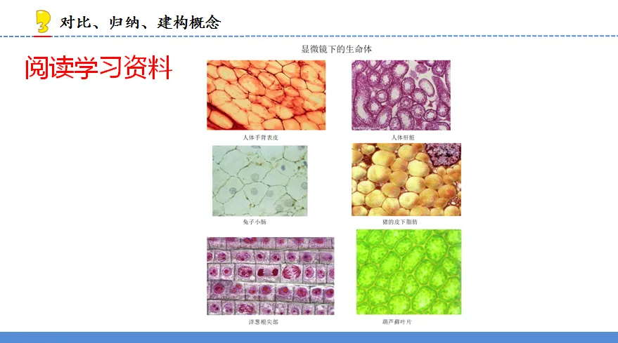 [设计意图:将显微镜下的洋葱鳞片内表皮结构与显微镜下的人体手背皮肤、人体肝脏、兔子小肠、猪皮下脂肪、洋葱根尖部、葫芦藓叶片的结构进行对比,引导学生寻找它们的相同点,让学生深刻了解“一个一个小格子”广泛存在于人、动物、植物等大部分生命体中,强化普遍性,进而让学生建构这些“小格子”是搭建生命体的“积木”。]