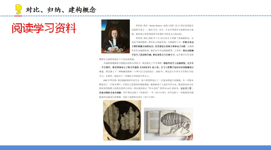 [设计意图:通过提供学习资料单,培养学生的阅读能力,让学生了解胡克是第一位发现并命名“细胞”的科学家,同时通过对胡克生平的了解,渗透和培养科学家精神,引导学生想伟大科学家学习。]