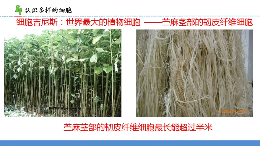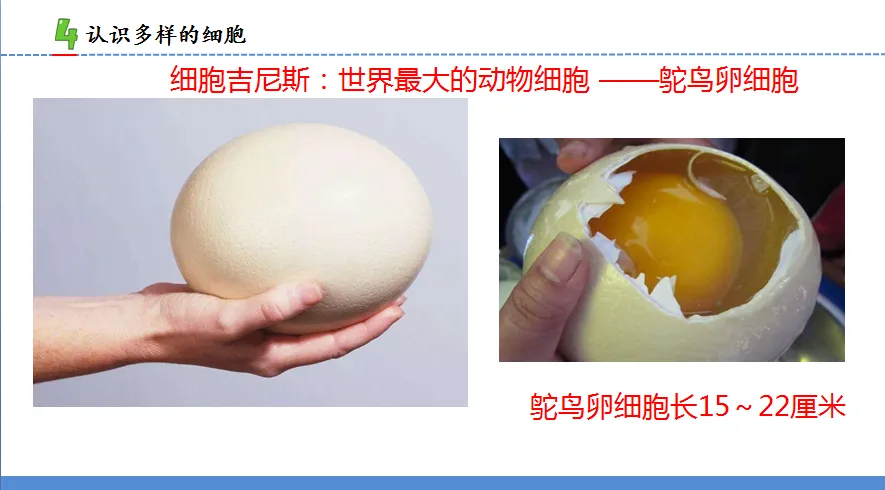 3.师展示鸵鸟卵细胞的图片和数据、苎麻茎部韧皮细胞的图片和数据,让学生了解最大的动物细胞和最长的植物细胞。