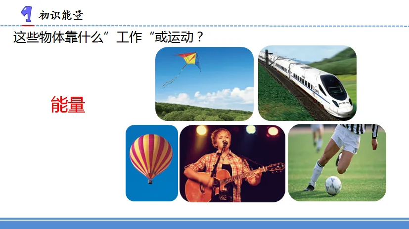 1.认识能量的本领,描述生活中的动能和势能。 理解能量能使物体工作或运动。
