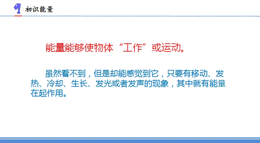 (能量能使“物体”工作或运动,只要有移动、发热、冷却、生长、发光、发声等现象,就是能量在起作用)