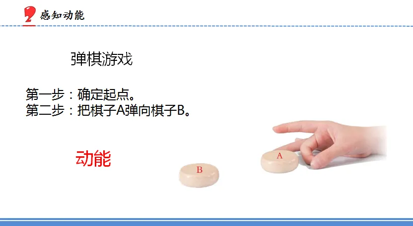 师:棋子为什么会移动?生:有能量。师:能量是怎么传递的?生:手指运动的能量传递给棋子A,棋子A就弹出去了,碰到棋子B,又把能量传递给棋子B,棋子B就接着移动了。师:像手指运动、棋子移动这样,运动的物体具有的能量就叫动能。