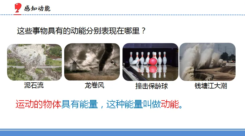 生:泥石流流动有动能,龙卷风运动有动能,潮水涌动有动能,保龄球滚动有动能。