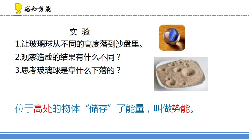 [设计意图:势能包含引力势能(如本实验的重力势能)和弹性势能等,在这儿用小玻璃球掉落在沙盘来研究重力势能,通过分析玻璃球掉落的原因,知道玻璃球因为重力而具有能量,这个能量是储存着的,当释放(松手)时就显现出来了,以此来帮助学生感知重力势能,明确在高处的物体是具有能量,释放后能量显现,位置越高,能量越多,砸的坑就越深。]