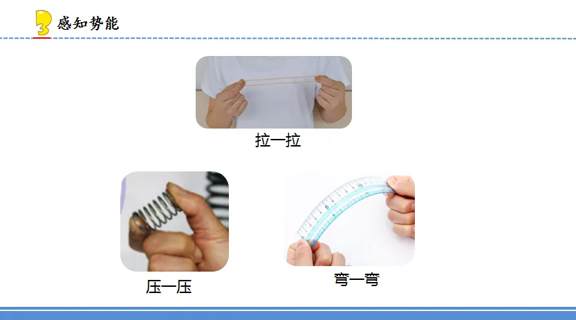 5.位于高处的物体“储存”了能量,叫做势能,其实不光位于高处的物体具有势能,老师还给大家准备了一些橡皮筋、弹簧、塑料尺,请你拉一拉、压一压、弯一弯,感受一下,想想这些物体的势能分别表现在哪里?