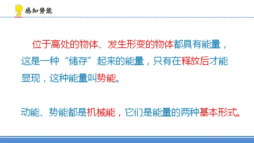 (通过游戏感受势能,知道高处的物体、变形的物体都具有势能,下落物体势能大小跟物体高度有关)