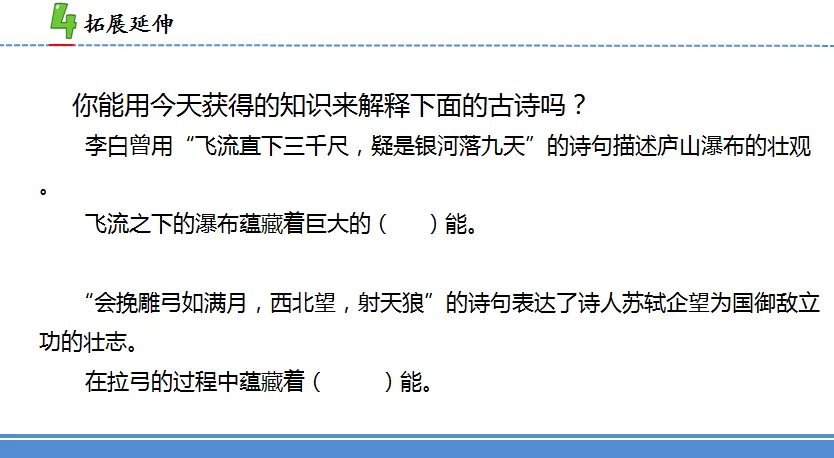 [设计意图:用学习的知识来解释古诗,其实是把知识迁移到日常生活中,用知识解释生活现象,既是对学生是否理解所学知识的一个检验,也是加深学生理解所学知识的一个途径,同时激发了学生进一步去探究能量的欲望,为后面的学习做好铺垫。]