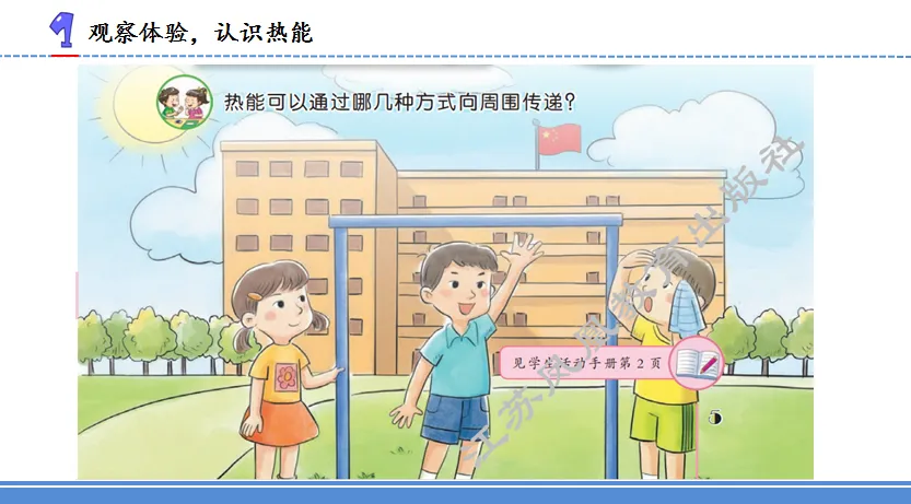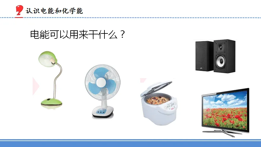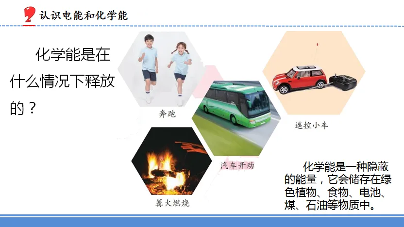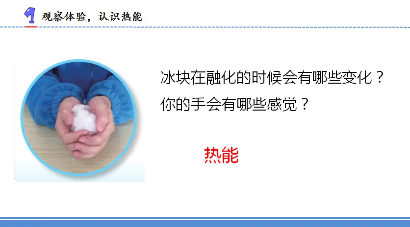 2.各种各样的能量 | 1 | 1.知道生活中能量有不同的表现形式,理解多种能量形式的作用。 2.能通过实验体验光具有能量。 3.懂得能量对于人类活动和自然界的活动有着重要作用。 | 重点:知道生活中能量有不同的表现形式,理解多种能量形式的作用。 难点:通过实验体验光具有能量,知道光与微波、X光都是电磁波,具有电磁能。 | 冰袋、辐射计、手电筒 | 1.通过观察和体验,了解什么是热能。 2.通过观察和体验,了解什么是电能和化学能。 3.借助辐射计,体验光具有能。 | ||