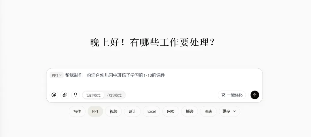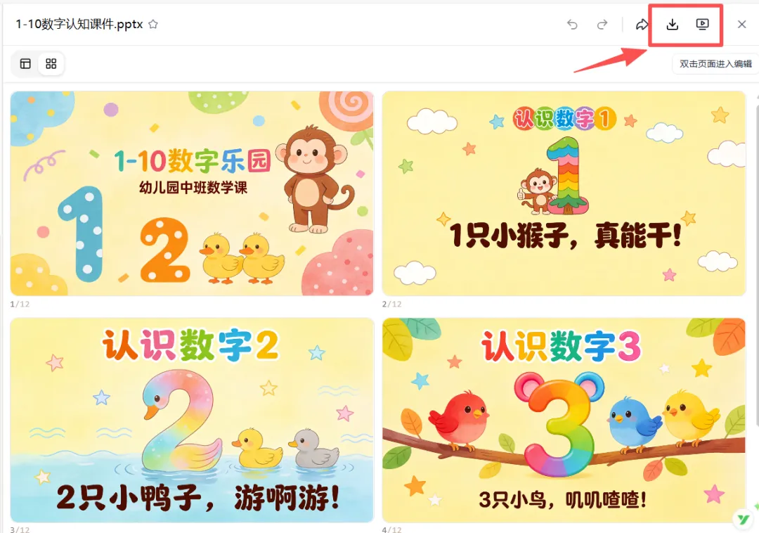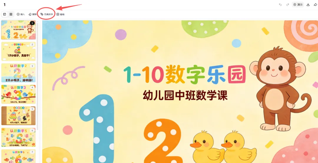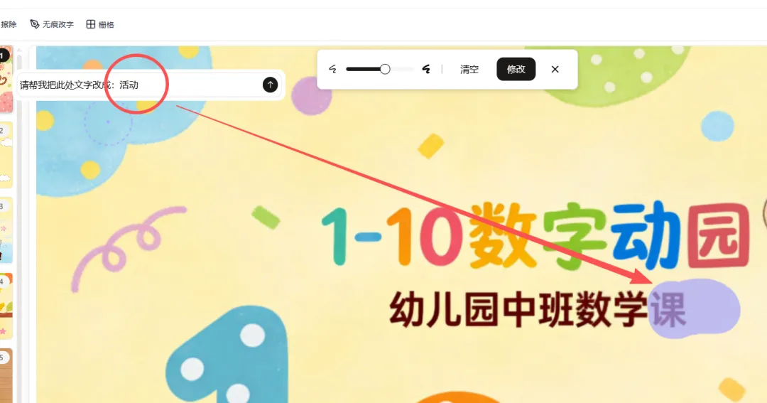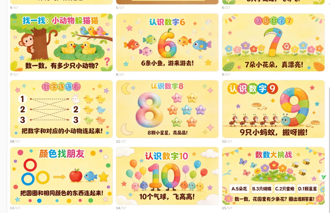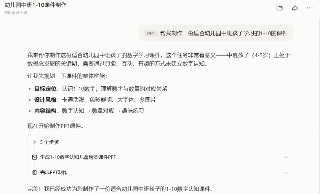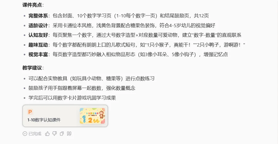 我随手写下了指令:帮我制作一份适合幼儿园中班孩子学习的1-10的课件
