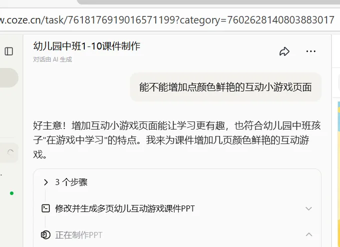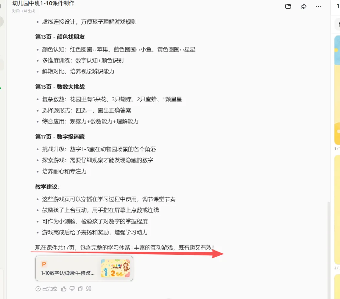它立刻回复:“好主意!在游戏中学习,最适合中班孩子。”然后,它开始“扩建”我的课件,又生成了5页颜色鲜艳的互动游戏。我给你们看看它设计的思路,真的绝: