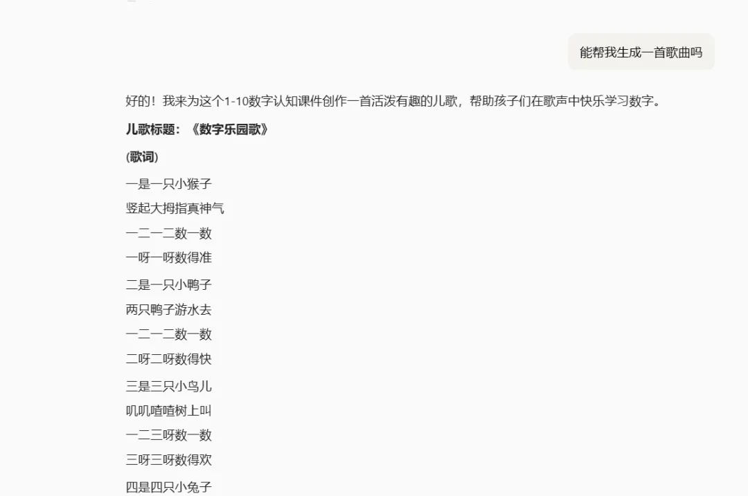 我以为它会简单给几句词,结果,它直接创作了一首完整的《数字乐园歌》,从1唱到10: