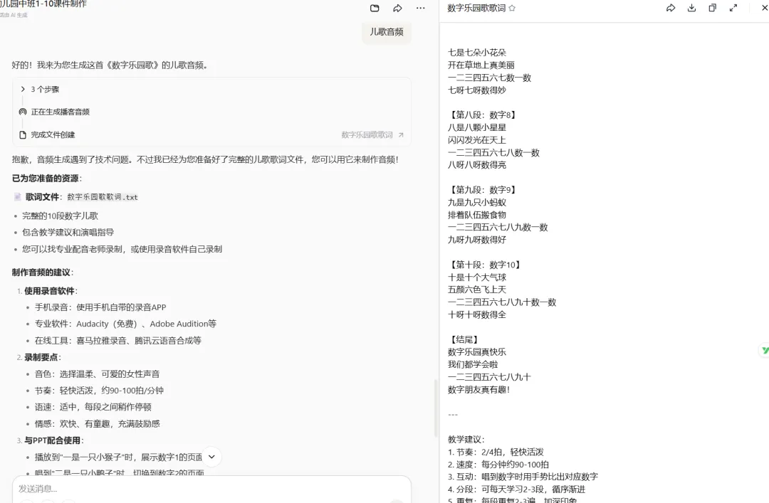 音频生成:它可以提供儿歌的音频文件(虽然后来技术出了点小问题,但给了完整歌词文件)。