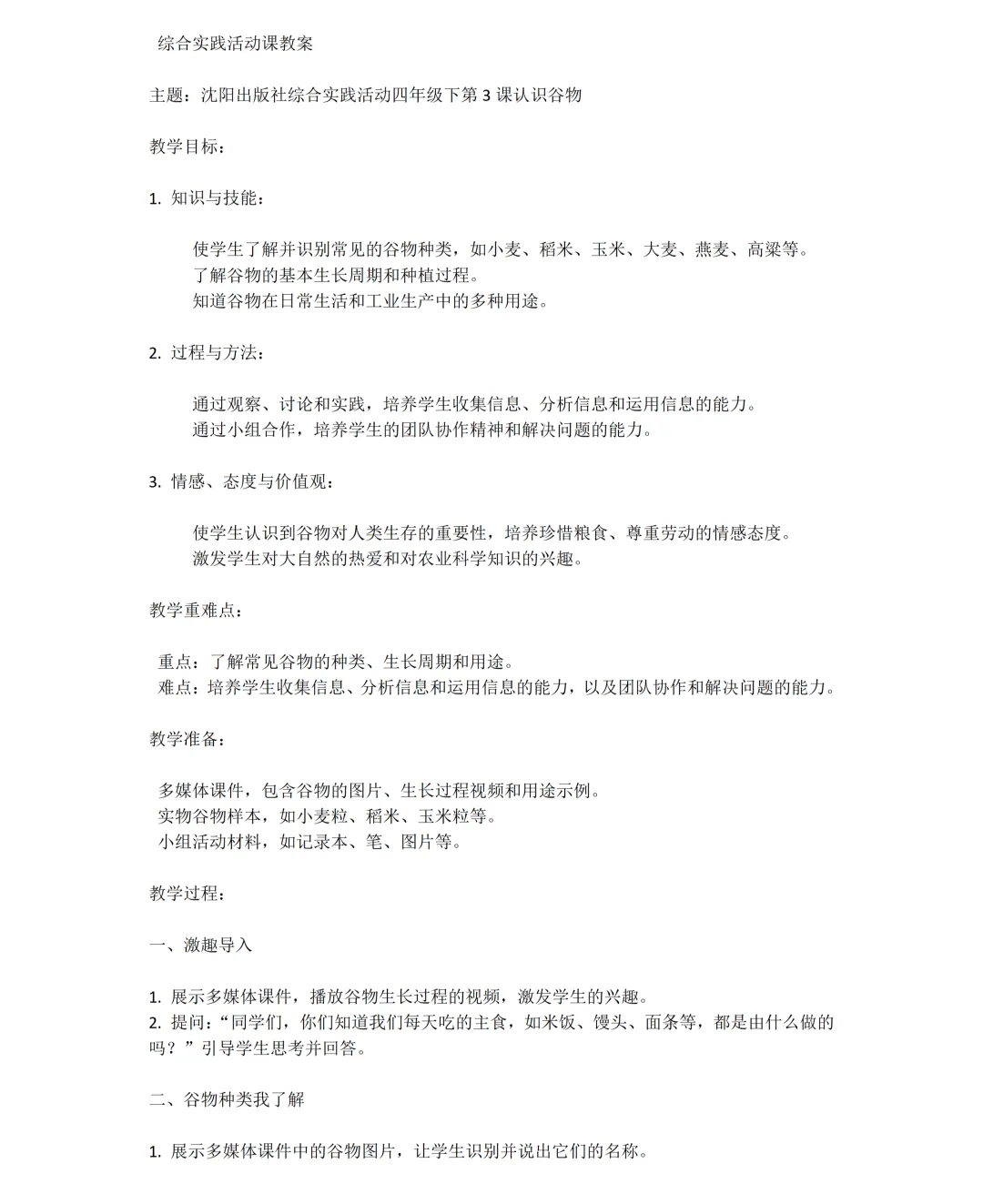 沈阳版《综合实践活动》四年级下册