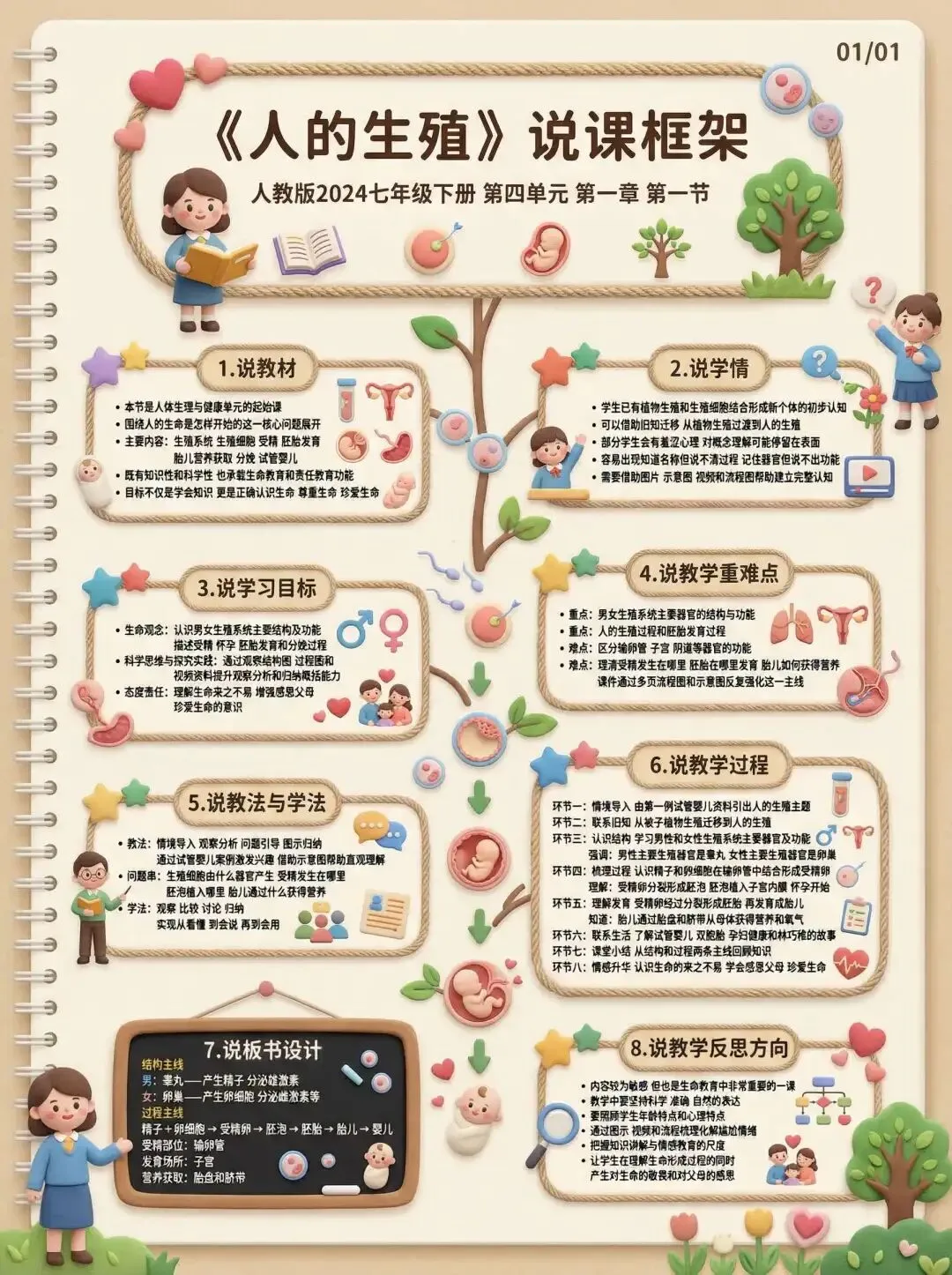 这一期和大家分享的是人教版2024七年级下册第四单元第一章第一节《人的生殖》的课件思路与说课框架整理。这一节内容是学生进入“人体生理与健康”单元后的起始课,也是帮助学生初步认识生命起点、理解人类生殖与胚胎发育过程的重要一课。课件从“试管婴儿”这一现实话题导入,引导学生在已有生物学知识基础上,逐步认识男女生殖系统的结构与功能,理解受精、怀孕、胚胎发育和分娩的基本过程,同时渗透珍爱生命、感恩父母的情感教育。