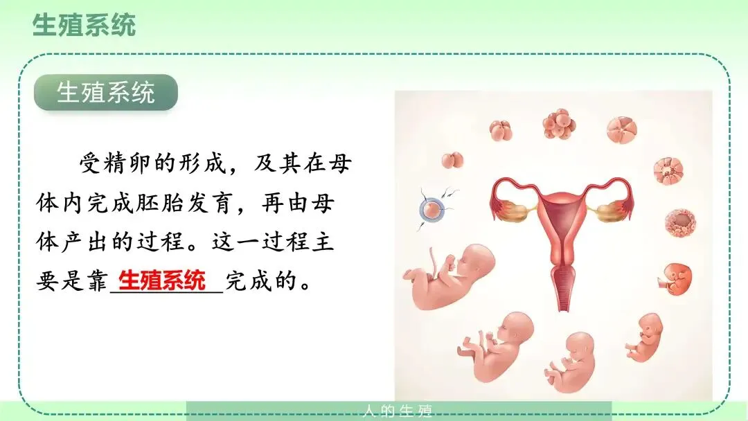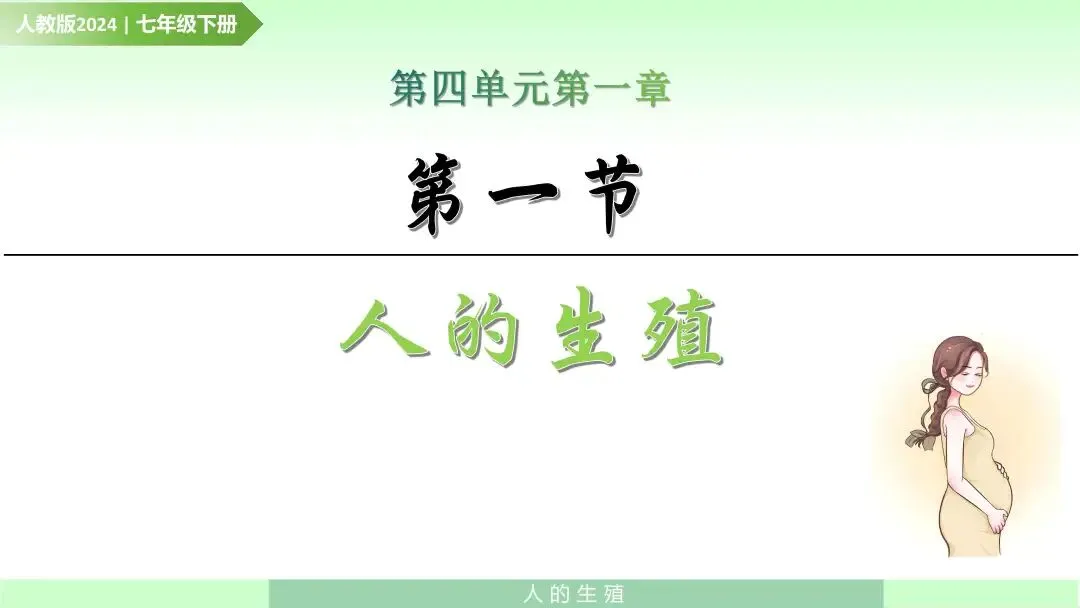 《人的生殖》是人教版2024七年级下册第四单元第一章第一节的内容,属于“人体生理与健康”这一单元的起始课。本节围绕“人的生命是怎样开始的”这一核心问题展开,主要包括男女生殖系统的结构与功能、生殖细胞、受精过程、胚胎发育、胎儿营养获取、分娩以及试管婴儿等内容。课件中先通过“世界上第一例试管婴儿”创设情境,再引导学生认识生殖系统,随后梳理受精、怀孕、胚胎发育和分娩的过程,最后通过练习与拓展完成知识巩固和情感升华。