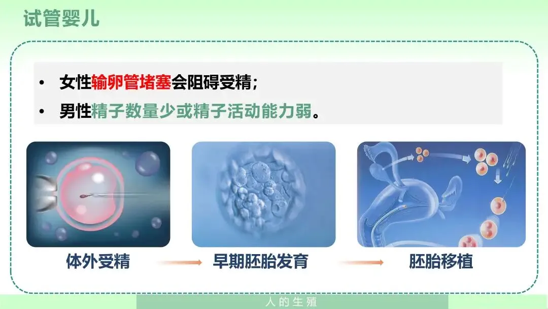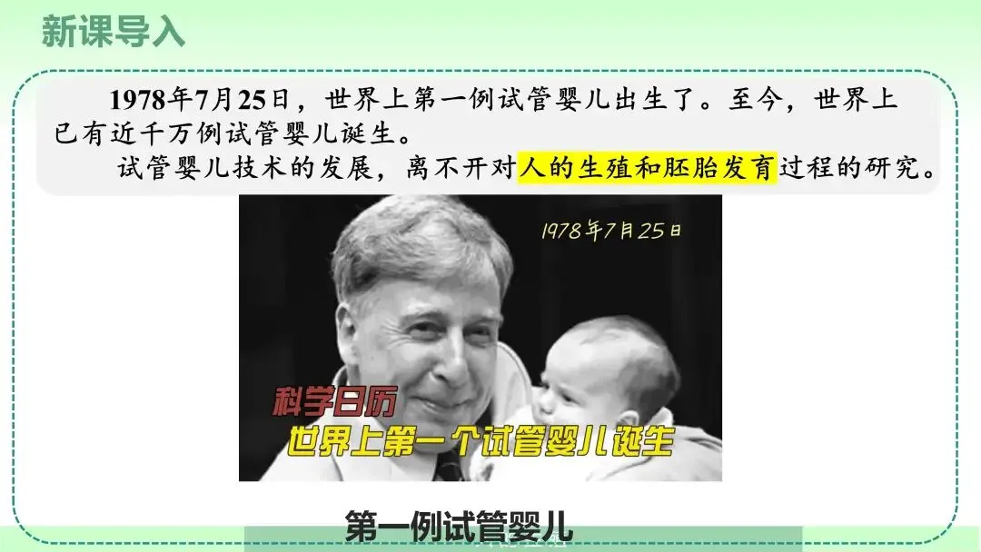 随后,我会结合课件中的“试管婴儿”内容进行拓展,引导学生认识现代生殖医学技术,理解体外受精、早期胚胎发育和胚胎移植的基本过程,让学生明白科学技术在帮助人类解决生育问题中的作用。