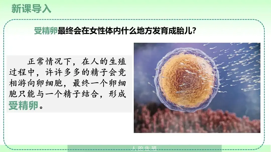 课堂开始,我会先出示课件中的“第一例试管婴儿”资料,引导学生思考:为什么试管婴儿技术的发展离不开对人的生殖和胚胎发育过程的研究?接着再呈现“受精卵最终会在女性体内什么地方发育成胎儿”这一问题,引发学生对本节课核心内容的关注。这样的导入既有现实意义,也能自然引出“人的生殖”这一主题。