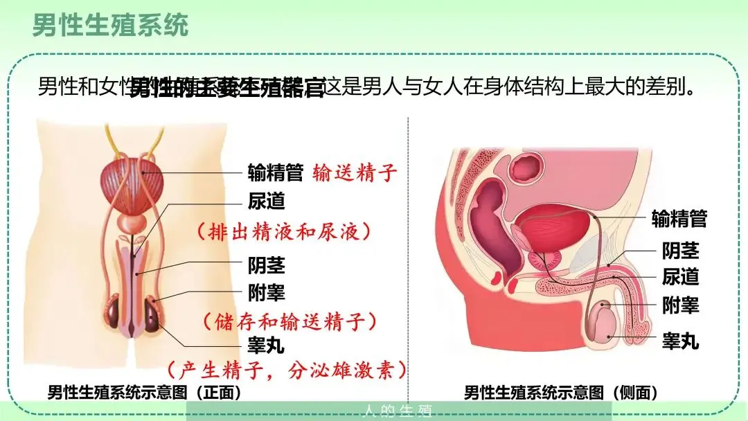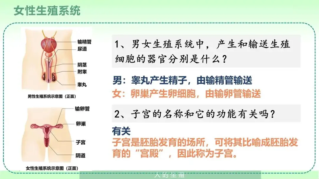 这一环节是本课的重要基础。我会引导学生结合课件中的男女生殖系统正面图和侧面图,认识男性生殖系统中的睾丸、附睾、输精管、尿道、阴茎,理解其主要功能;再认识女性生殖系统中的卵巢、输卵管、子宫、阴道,理解它们分别在产生生殖细胞、输送卵细胞、胚胎发育和胎儿产出中的作用。