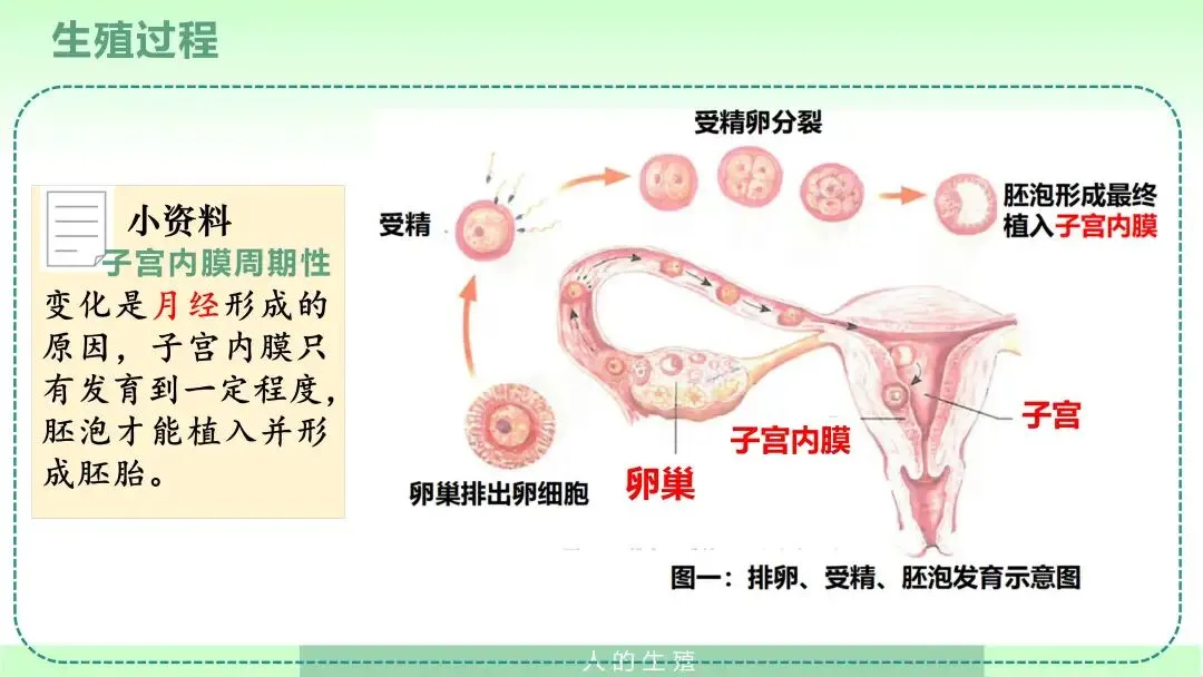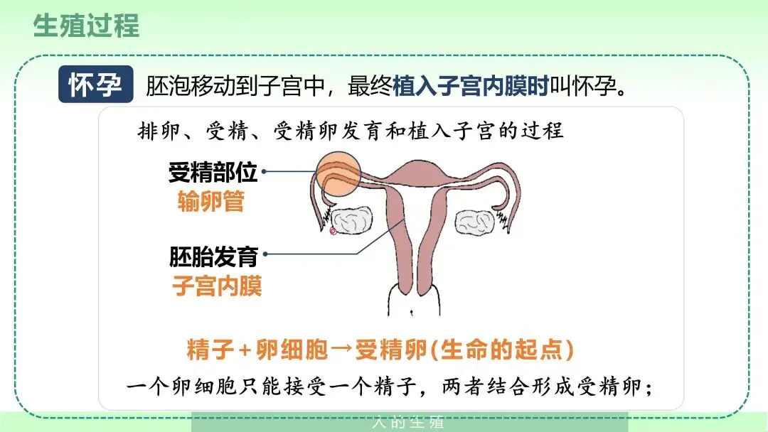 在学生认识结构之后,我会带领学生进入“生殖过程”的学习。先明确精子和卵细胞都是生殖细胞,含有遗传物质;再借助课件中的示意图,引导学生理解受精发生在输卵管中,一个卵细胞一般只能与一个精子结合形成受精卵。接着说明受精卵不断进行细胞分裂,逐渐发育成胚泡,胚泡缓慢移动到子宫中,最终植入子宫内膜,这就是怀孕的开始。