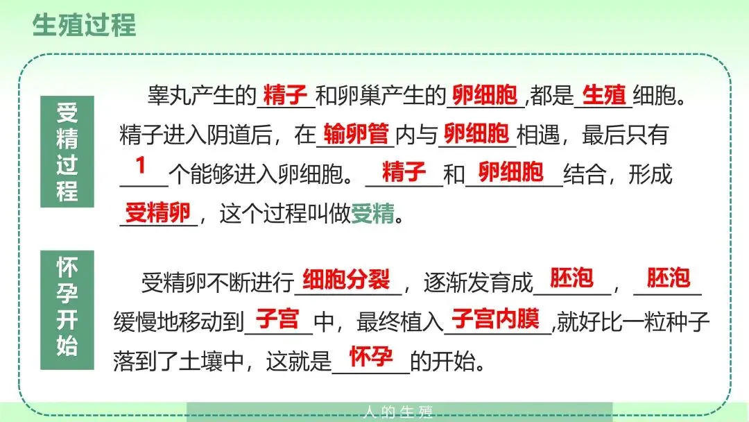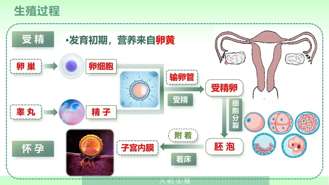 在学生掌握主要结构后,我会进入本节课的核心内容之一,即人的生殖过程。